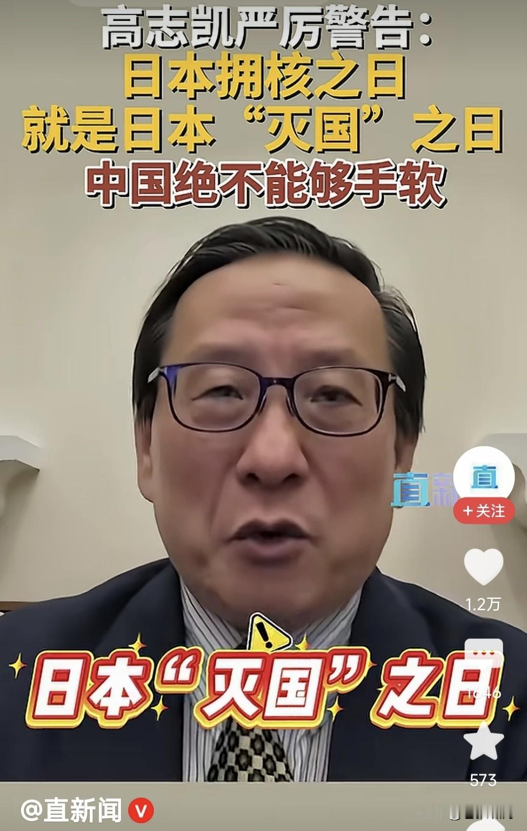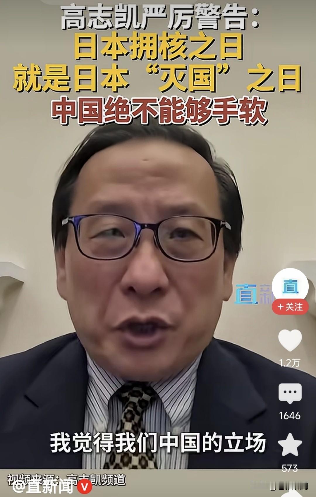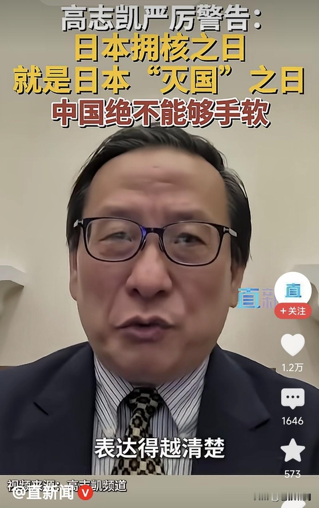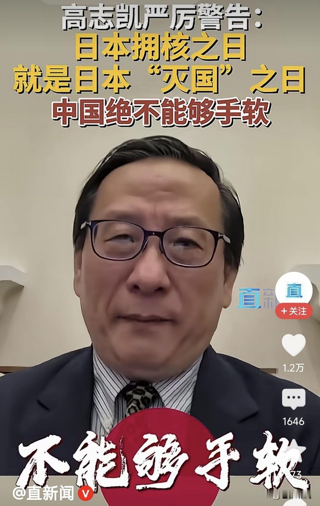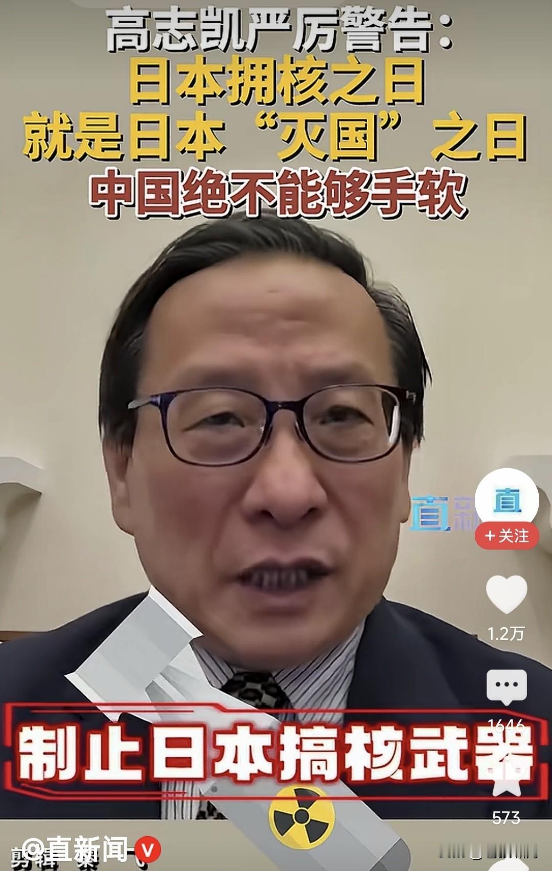 高志凯教授发警告:日本拥核之日,就是其“灭国”之时!我觉得我们中国的立场,表达得越清楚,越能制止日本搞核武器。这次我们绝不能手软! 高教授这番话,明显是针对日本首相高市早苗,最近表示“日本有权利拥有核武器”的言论,发出的警告! 按照二战同盟决议,日本是“二战战败国”,不能拥有军队和进攻性武器,这就是为何日本军队叫自卫队,并且不能出海,没有航空母舰的原因! 但近年日本右翼崛起,企图改变以上现实,拥有“军队”并且出海,发展进攻性武器,包括航母和核武器。根据日本科技水平,这些都是手到擒来! 尤其高市上台,向特朗普提到“拥有核潜艇”之事,竟然得到川普支持!按说日本是“核武器受害国”,应坚决反对核武器,高市提核武计划何意? 中国政府已经表达“反对日本拥有核武”的立场!高志凯教授表达个人态度亦无不可,但作为“国际智库专家”,说话不要太口满,要留有回旋余地! 什么叫“日本拥核之日就是灭国之时”?什么叫中国“绝不能手软”?对于高市想“拥核”这件事,国家自有分寸,并且已经表明态度,用你火上浇油? 如果高市一意孤行,“不靠谱”又力挺高市,日本果真发展核武,高教授该如何应对?怎么“不能手软”?“日本拥核之日就是灭国之时”如何兑现呢? 本人觉得高教授,作为“国际智库”副主任,只是学术研究人员,对国际问题提建议,要有理有据有节,说没有回旋余地的大话狠话,有何实际意义? 此前曾有项专家鼓噪:中国需要一战立威!昨日看到金教授说:大国不狠,无人害怕!今天又见高教授这些言论,感觉很无语。发狠能解决问题吗? 当下世界错综复杂,各国较量十分激烈。真是牵一发而动全身,稍有不慎就引火烧身,影响经济持续发展! 对于上述问题,国家会审时度势,做出正确判断理性回应!你们这些“专家教授”频繁“火上浇油”是何用意? …………