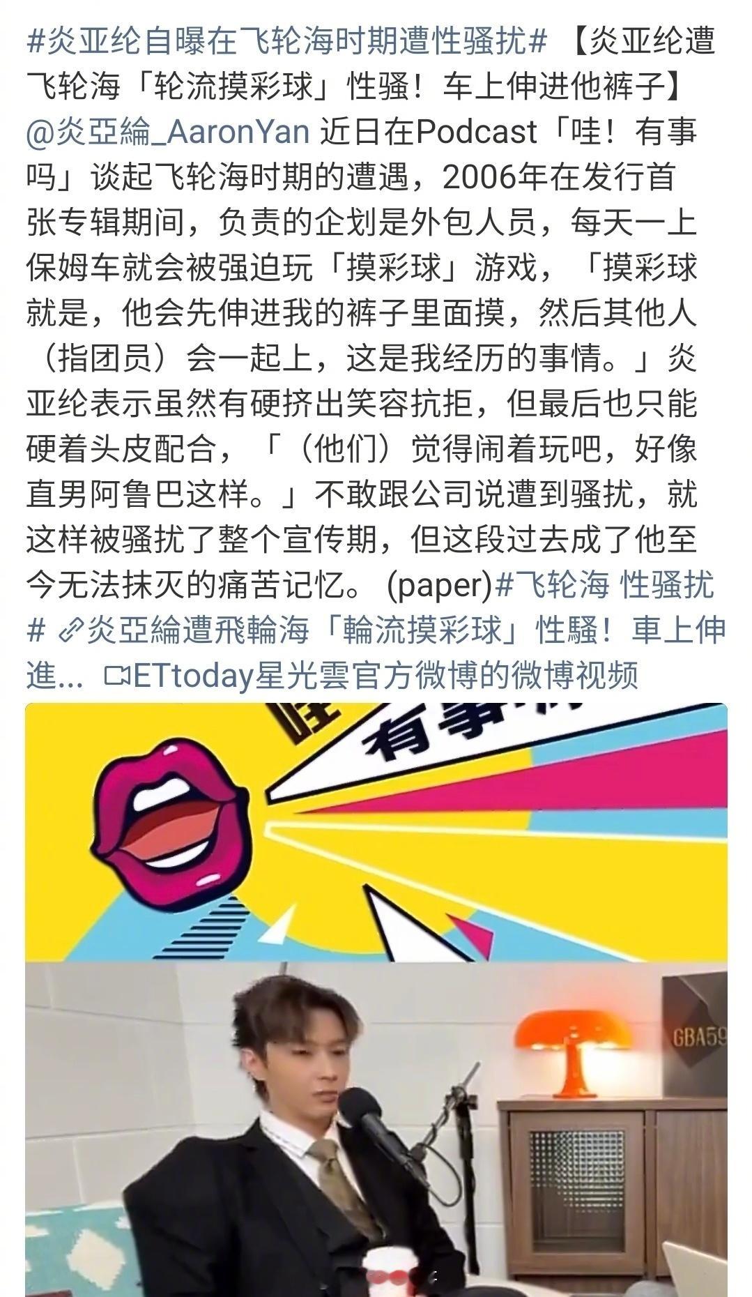 炎亚纶说之前在飞轮海宣传新专辑的时候,其他成员会摸彩球,就是把手伸进他的裤裆,他说自己只能挤出笑容抗拒