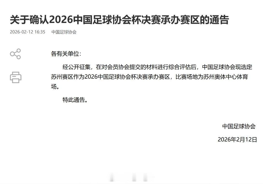 北京时间2月12日,中国足协官方发布公告,确认苏州赛区将承办2026足协杯决赛,
