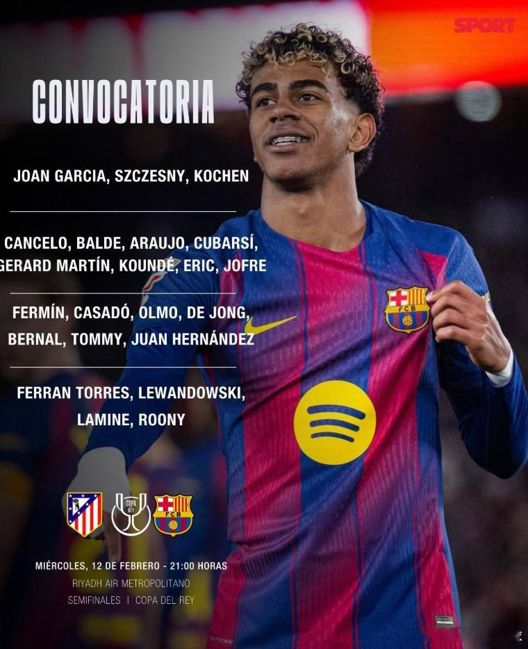 雷速体育2月12日讯25/26赛季西班牙国王杯半决赛首回合,巴萨客场对阵马竞的大名单公布。