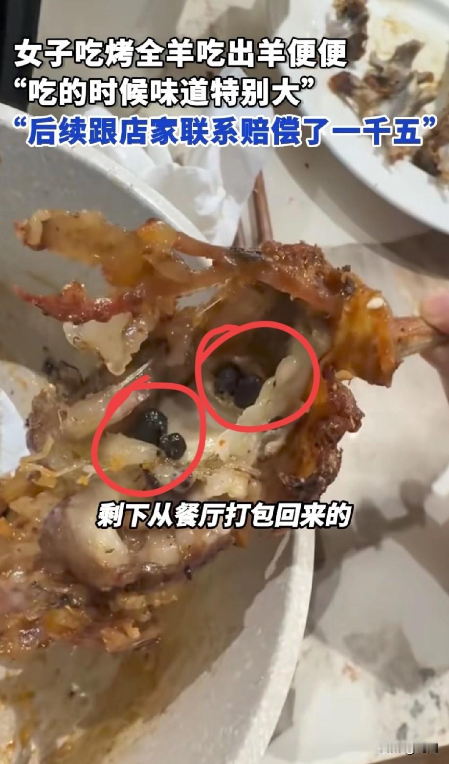 四川女子吃烤全羊吃到“羊粪蛋” 店家赔偿1500元! 2月12日,女子称“当时吃羊肉,越吃越不对劲,味道很大,不是腥味是臭味,打开一看差点晕厥,竟是一堆羊便便!这份羊肉是当时在餐厅打包回来的,大过年的吃到羊粪蛋,真的很恶心” 立刻联系店家,店家称愿意赔偿1500元作为补偿…… 这食材处理的太不干净了!外面的餐饮真让人无语啊,还好商家没狡辩,要不然会说这是豆豉[捂脸],再就是幸好羊它是吃草长大的,当是吃了一顿“特色黑珍珠烤羊”吧……