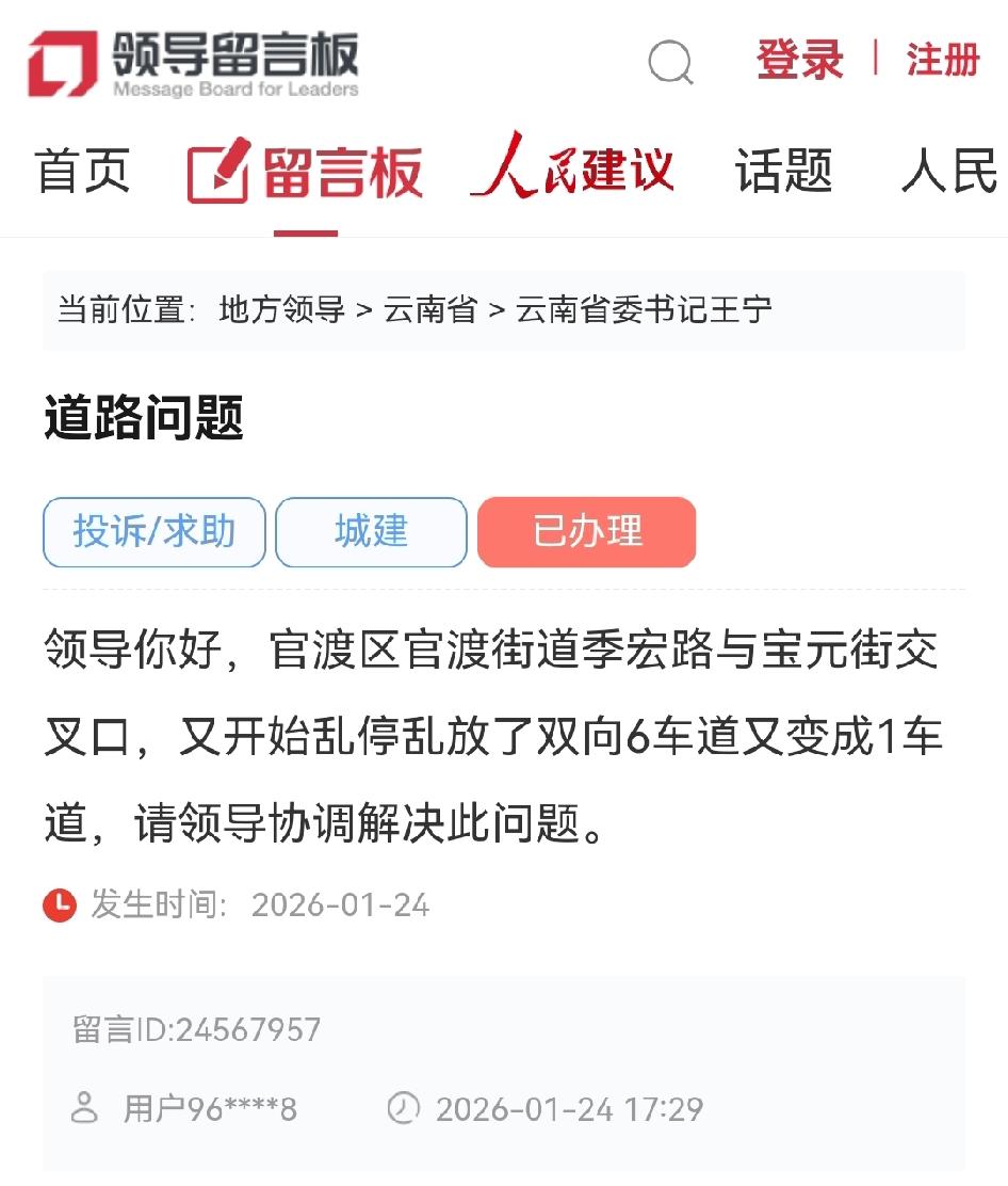 昆明网民反映官渡区季宏路、宝元街违法停车的事项 1月24日昆明网民通过领导留言板给云南省委书记留言 ▶️道路问题 领导你好,官渡区官渡街道季宏路与宝元街交叉口,又开始乱停乱放了双向6车道又变成1车道,请领导协调解决此问题。 发生时间:2026-01-24 2026-02-10 19:00 昆明市公安局交警支队官方回复 网民同志:您好! 您通过人民网领导留言板的留言收悉,经昆明市公安局交通管理支队(以下简称交管支队)认真调查处理,现将有关情况回复如下: 关于您反映官渡区季宏路、宝元街违法停车的事项,交管支队高度重视。经核实,您所述路段为在建状态,目前由属地社区及道路承建方负责管理。针对您反映的问题,交管支队采取以下工作措施: 一是主动对接属地办事处、道路管理方,通报相关情况,商请其协同交管部门加强对上述道路的管理。二是联合社区对该路段停放影响通行的车辆开展劝离及粘贴温馨提示单等工作,劝导广大驾驶人文明参与交通。三是积极对接官渡区人民政府,反馈群众诉求,全力推进该片区道路建设,同步完善交通安全设施。 您若遇相关路段有交通拥堵或者车辆违停等情况时,可拨打交管支队或者辖区三大队电话,交管支队将第一时间指派警力前往处置。 下步工作中,交管支队将依法履行法定职责,持续加大巡逻管理力度,不断优化交通组织,为广大人民群众创造一个有序、安全、通畅的道路交通环境,不断提升人民群众对交通管理工作的满意度。 感谢您的理解与支持,顺祝身体健康、生活愉快!昆明乱停车 昆明停车纠纷 机场东路乱停车 昆明停车位划线 昆明停车难 停车