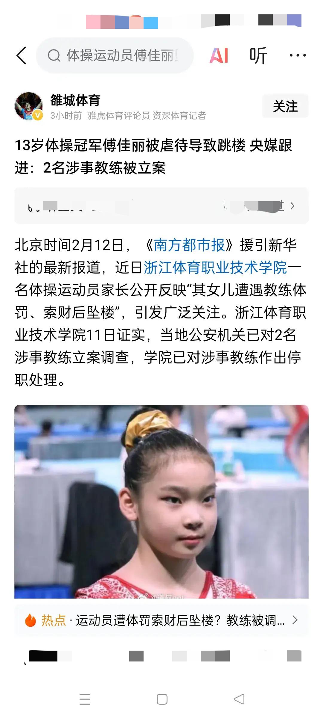 13岁体操冠军遭虐待跳楼,别让金牌掩盖了对孩子的恶! 13岁,本该是无忧无虑、被捧在手心的年纪,可体操小将傅佳丽,却在本该追梦的训练场,被逼到绝望跳楼。每想一次,都让人揪心到窒息。 她是赛场上的冠军,却成了某些人眼里的“工具人”。 体罚、精神折磨、肆意打压,所谓的“严师出高徒”,不过是施暴者最无耻的借口。 竞技体育的意义,从来不是用伤害换成绩,更不是把孩子逼到崩溃边缘。 如今央媒重磅发声,两名涉事教练被立案调查,大快人心的背后,更该让人警醒。比处罚更重要的,是堵住所有伤害孩子的漏洞。 孩子的健康和尊严,永远比奖牌更珍贵。那些藏在角落的黑暗,必须被彻底揪出来,绝不姑息。