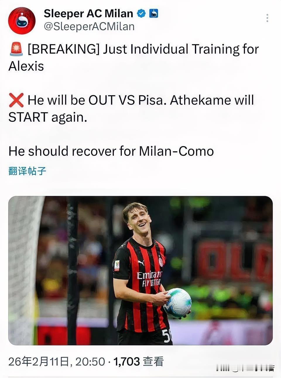 萨勒马克尔斯无法出战米兰与比萨之战。萨勒马克尔斯依然无法完成球队合练,他的内收肌依然会感受到不适,米兰与比萨之战阿泰卡梅会继续担任右边翼卫主力。 萨勒马克尔斯在之前放假时候就主动到训练场训练,他表达他希望能快点回归球队。萨勒马克尔斯的心情能理解,但个人觉得比萨不上真的不是坏事,就当轮换了,毕竟下周中还要踢科莫,科莫从主教练到队员都憋着气想赢米兰,那是硬仗,需要萨勒马克尔斯这样的球员上去搞科莫的心态。 个人想法,萨勒马克尔斯本赛季刚刚回来的时候真的有眼前一亮的感觉,但后面随着比赛深入,他的坏毛病又出现了,只要他踢美了就开始疯狂的自我表现,眼里除了球门啥都看不到,阿泰卡梅上场首发表现中规中矩,可以考虑未来多给阿泰卡梅一些机会,多踢踢首发也算是给56装个限制器。