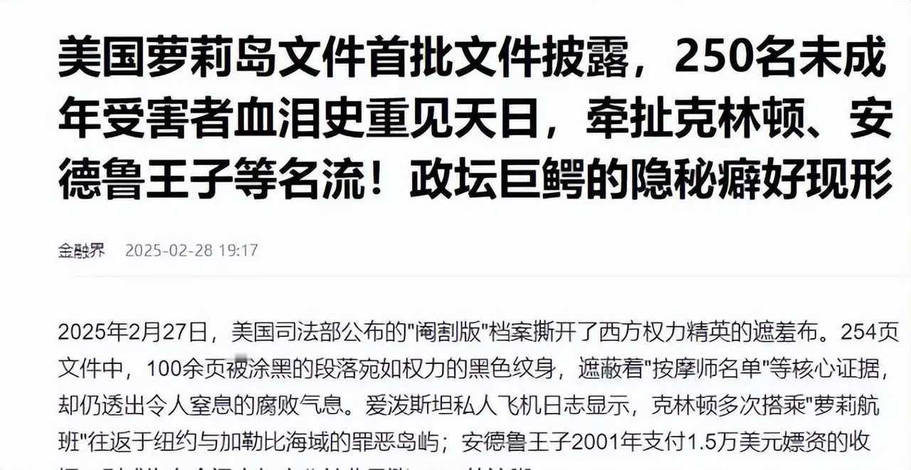 爱泼斯坦案爆雷,或许成为压死西方文明的最后一根稻草! 300万页机密文件解封、2000段视频、18万张图片曝光!爱泼斯坦萝莉岛的惊天黑幕,彻底撕碎了西方文明最后的遮羞布! 从爱泼斯坦离奇“自杀”的重重疑云,到多国总统、王室成员、亿万富豪深陷罪恶泥潭,这场跨越二十年的权贵狂欢,早已不是简单的性丑闻,而是西方文明从根上腐烂的铁证!这一次,爱泼斯坦案的全面爆雷,就是压死西方自诩“文明灯塔”的最后一根稻草! 萝莉岛:不是度假天堂,是吞噬少女的人间炼狱。 在西方精英的口中,爱泼斯坦的私人岛屿是名流社交的度假胜地,可真相却令人毛骨悚然。 这座被称为“萝莉岛”的小岛,是爱泼斯坦精心打造的罪恶囚笼。他以“模特经纪”“高薪兼职”“教育资助”为诱饵,专门诱骗东欧、南美等地贫困、无依无靠的未成年少女,最小的受害者年仅11岁。 登岛之后,这些女孩彻底失去自由,被编号、分类,如同商品目录里的货品,任由权贵挑选、肆意虐待。岛上布满监控与保镖,隔绝了一切外界救援,更有功能诡异的房间和设备,藏着远超寻常性虐待的变态行径,甚至出现“食人仪式”的证词——这不是乐园,是践踏人性、吞噬生命的刑场! 西方天天挂在嘴边的“人权”“平等”“保护弱势群体”,在萝莉岛的罪恶面前,变成了最刺耳的谎言。 离奇“自杀”:权力圈最精准的“封口”操作。 爱泼斯坦的罪行,从来都不是秘密。 2005年就有受害者家属报警指控他性虐待未成年少女,可他却靠着权贵关系,仅以教唆卖淫的轻罪被判13个月,服刑期间还能自由外出工作。 直到受害者不断发声,罪证无法掩盖,爱泼斯坦再次被捕,面临终身监禁的指控。可就在庭审前夕,他被发现死于牢房,官方结论轻描淡写:自杀。 死前两天,他刚签署数亿美元资产分配的遗嘱;牢房监控离奇失灵;狱警全程失职……所有“巧合”都指向同一个真相:有人必须让他永远闭嘴。 爱泼斯坦手里攥着的,不是荒淫的八卦,是能撼动西方权力图谱、颠覆国际秩序体面的致命秘密。活着的他,是悬在无数权贵头顶的达摩克利斯之剑;死去的他,才是权力网络最想要的“安全结局”。 多国政要牵扯:西方精英圈的遮羞布被彻底撕碎 这份300万页的文件,像一张大网,网住了西方乃至全球的顶级权贵: 美国前总统克林顿,名字出现超70次,数十次乘坐“洛丽塔快线”登岛,所谓“人道主义工作”的辩解苍白无力; 美国前总统特朗普,被提及上千次,昔日亲口称赞爱泼斯坦“喜欢年轻美女”,如今拼命切割却难掩过往勾结; 印度总理莫迪、乌克兰等多国领导人,英国王室、科技巨头、华尔街富豪悉数在列,西方精英圈彻底裸奔。 一边在国际舞台上大谈民主、输出价值观,一边在萝莉岛践踏未成年少女的尊严;一边标榜法律至上,一边为权贵量身打造“法外之地”。 西方的双标与虚伪,在这份文件里暴露得淋漓尽致。 文明崩塌:西方“灯塔神话”彻底走向末路! 西方向来以“文明灯塔”自居,把自己包装成道德高地、正义化身,对他国指手画脚。可爱泼斯坦案,彻底戳破了这层泡沫。 当权贵可以凌驾于法律之上,当未成年少女沦为权力的“社交货币”,当司法系统沦为保护罪恶的工具,所谓的西方文明,早已只剩下空洞的口号。 这不是一个人的罪恶,是整个西方精英阶层的集体堕落;这不是一起孤立的案件,是西方制度性腐烂、文明根基崩塌的集中爆发。 爱泼斯坦案的爆雷,让全世界看清:西方的光鲜亮丽,不过是包裹着腐烂内核的糖衣。那些被捧上神坛的“文明”“民主”“人权”,在权力与欲望的狂欢里,早已被碾得粉碎。 这根压死西方文明的最后一根稻草,终于重重落下。 从此,西方自诩的文明灯塔,彻底熄灭;西方编织的文明神话,彻底破碎!西方文明值得学习吗 西方文明的真相 西方权贵深陷爱泼斯坦案 爱泼斯坦被曝可能没死 爱泼斯坦的萝莉岛有多肮脏