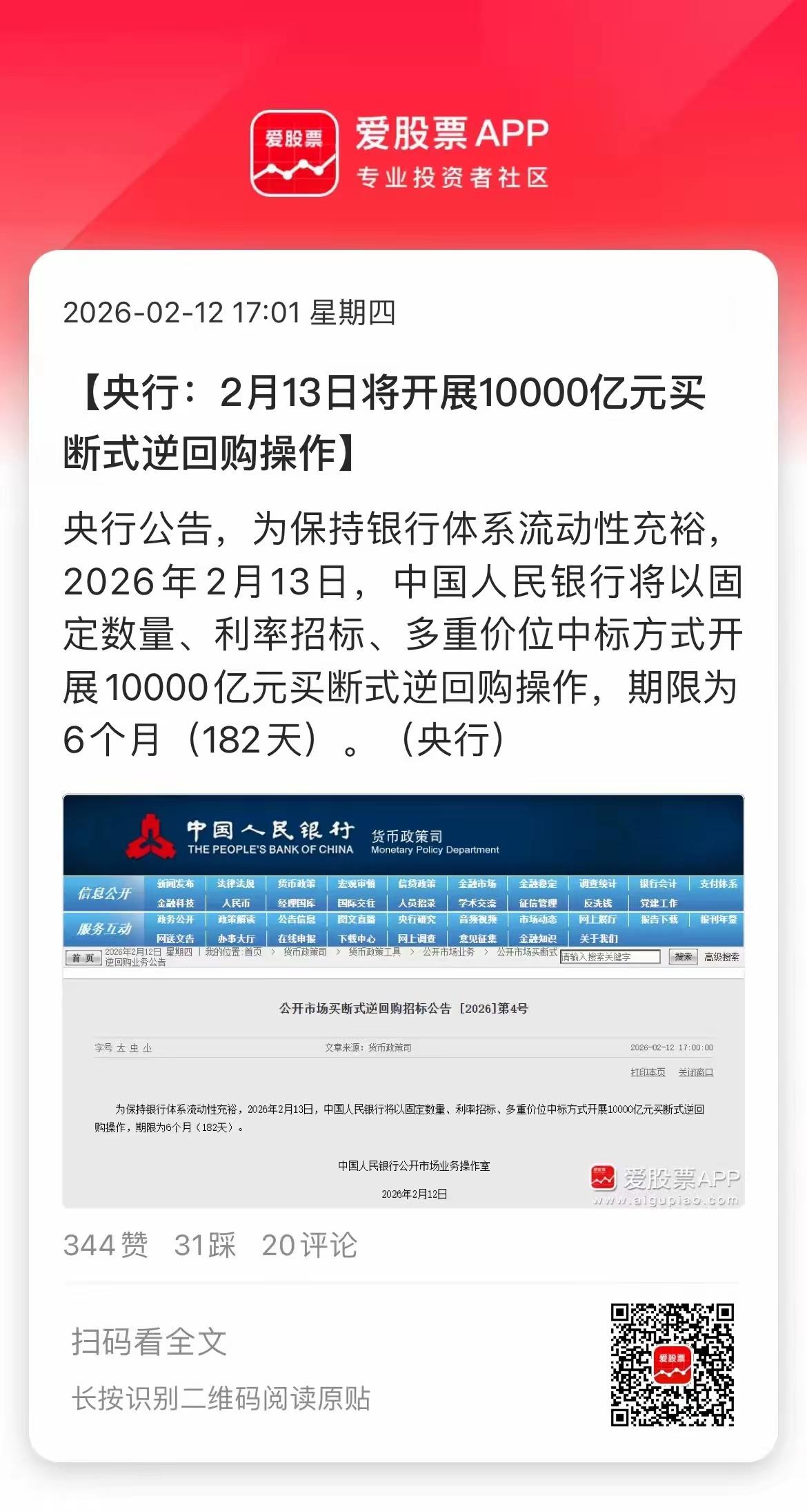 央行又撒水1万亿了,由于本月有5000亿6个月买断式逆回购到期,等于净投放5000亿。 之前的2月3日,央妈净投放了1000亿元,说明这个月总共6000亿。由于这个月有春节,央妈这是量大管饱了,继续给市场释放流动性!虽然最近没有降准降息,但现在的市场不缺钱;今天节前倒数第二个交易日,还有2万亿+成交量呢。央行这个神助攻,明天红包行情应该不会缺席的。