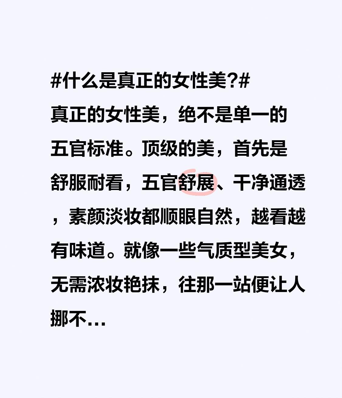 什么是真正的女性美? 真正的女性美,绝不是单一的五官标准。顶级的美,首先是舒服耐看,五官舒展、干净通透,素颜淡妆都顺眼自然,越看越有味道。就像一些气质型美女,无需浓妆艳抹,往那一站便让人挪不开眼。 真正的女性美还自带气场,是由内而外的自信与从容,一颦一笑落落大方,能在人群中轻松成为焦点。而且久处不厌,美在骨相,更在气质与修养,温柔、通透、有分寸。 女性美也是多重维度的,有内在力量的觉醒,外在表达的节制,时间沉淀的馈赠,以及能量场的构建。这样的美,才是真正的女性美,无论走到哪都自带光芒。