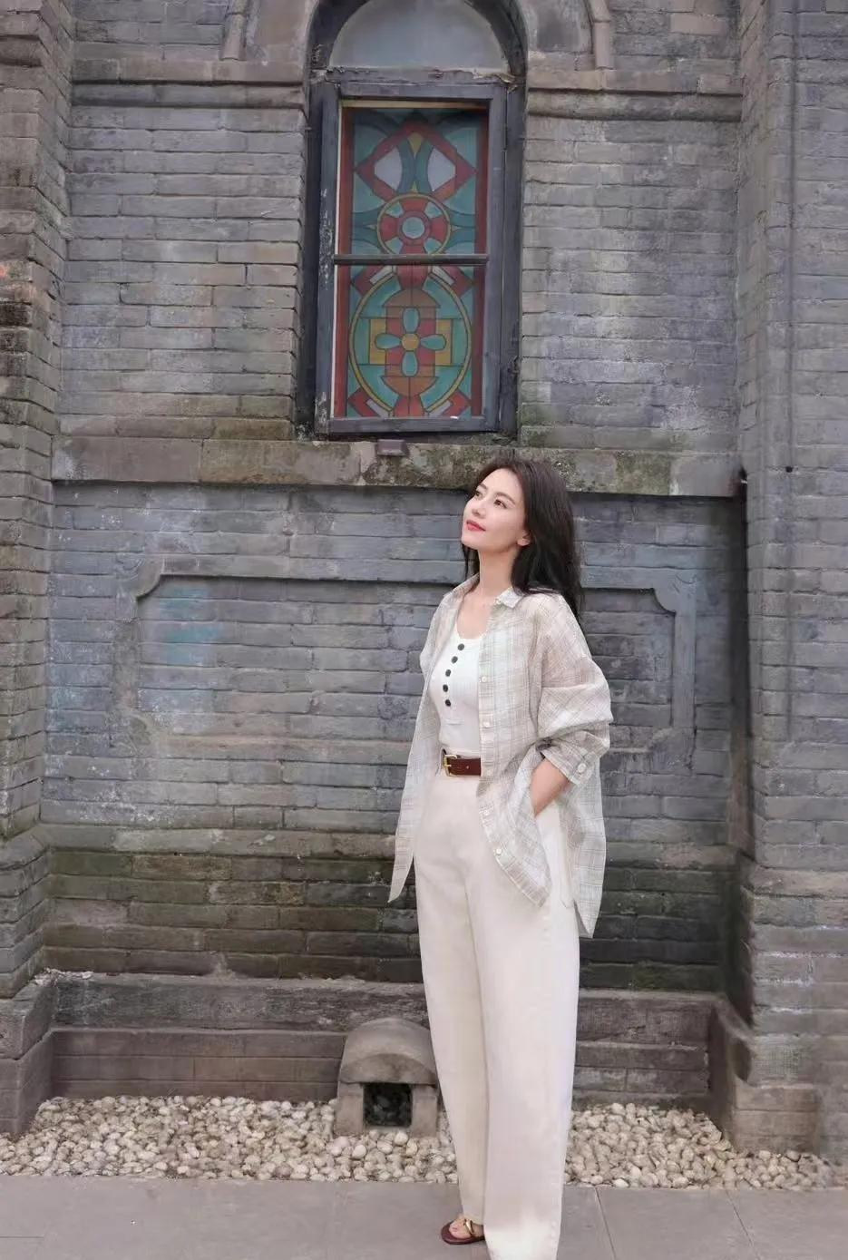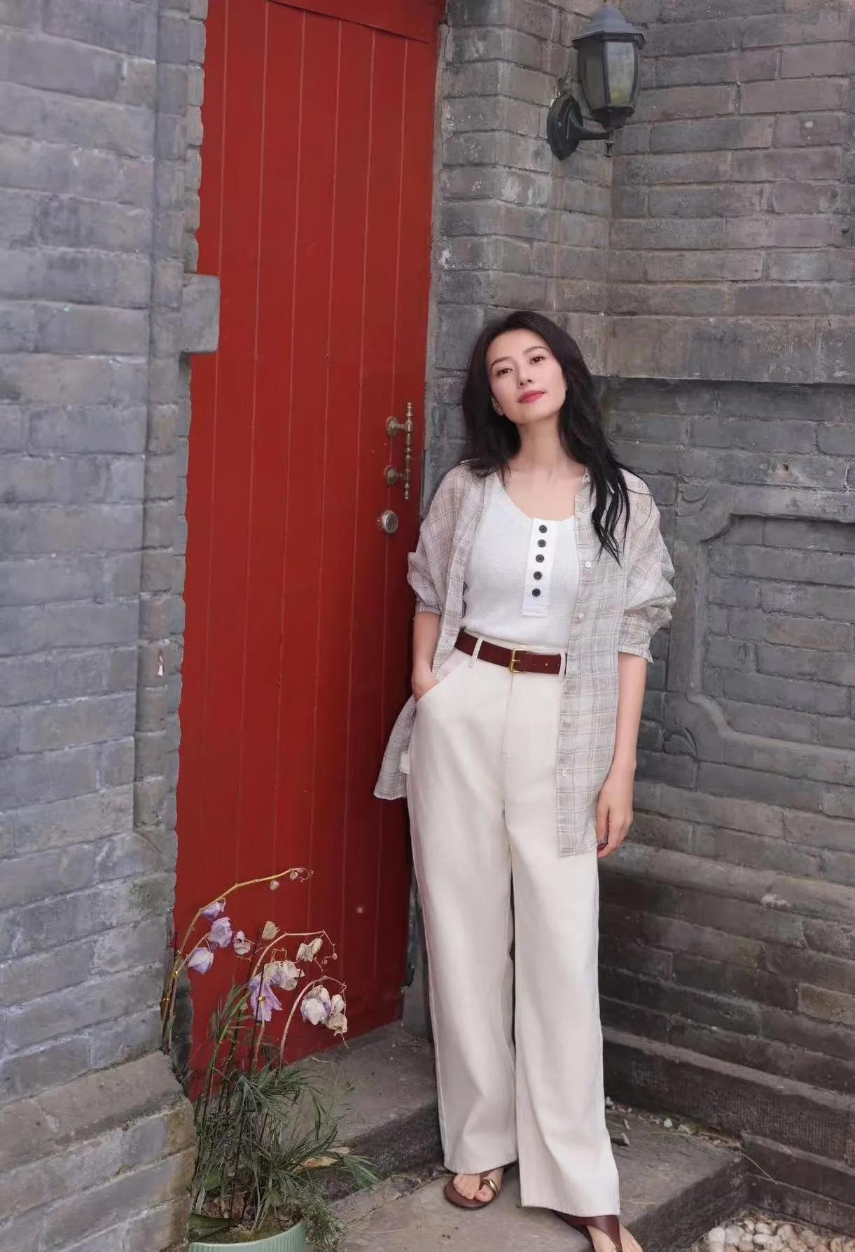 圆圆“衬衫+阔腿裤”火了!🔥 浅格衬衫当开衫,内搭白扣背心,再配米白阔腿裤,不仅打破了单调,还秒变“腿精”,视觉上直接瘦十斤! 棕色皮带和夹脚拖的组合,又甜又飒,难怪网友都说:这才是普通人能抄作业的明星穿搭! 高圆圆 阔腿裤穿搭 显高显瘦穿搭