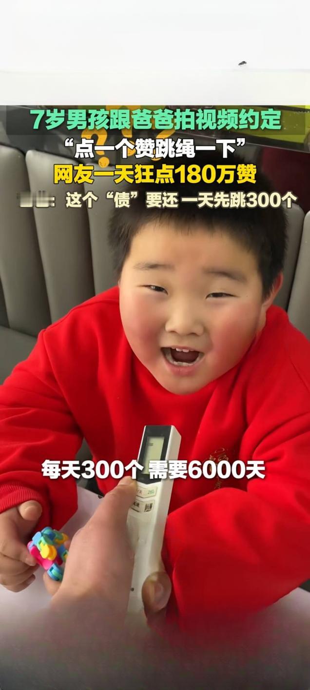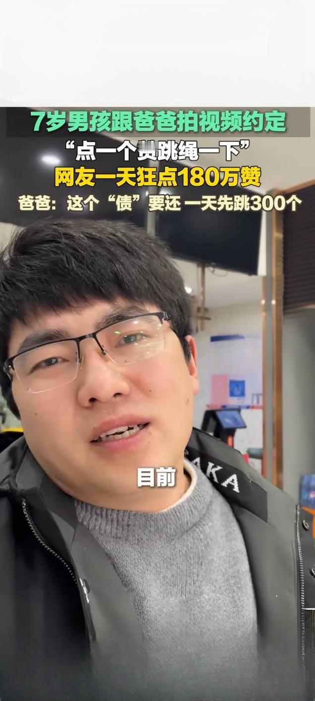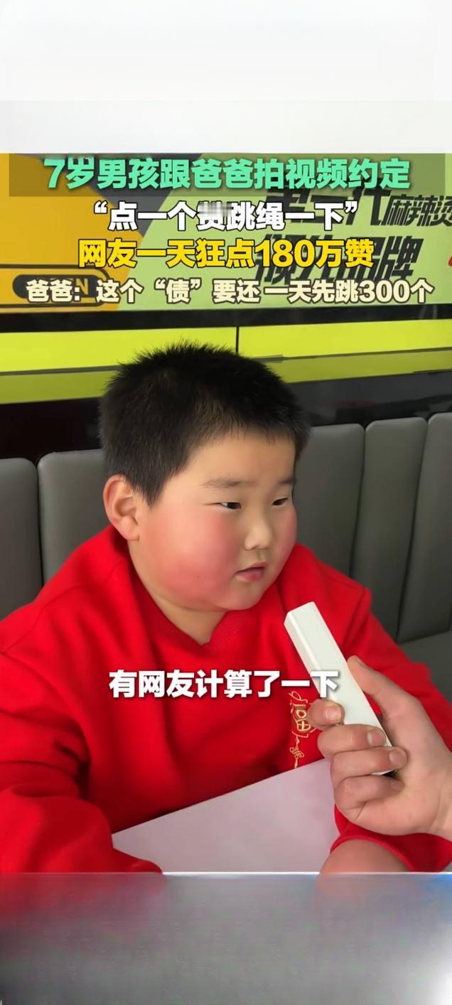 7岁男孩减肥与父约定点赞数即跳绳数 网友狂点180万赞引热议 近日,山东临沂一名7岁男孩糖豆与父亲的跳绳减肥约定,在快手平台意外走红。这条记录父子约定的视频播放量达9521次,点赞数却在一天内飙升至180万,让原本的趣味约定变成了一场特殊的“挑战”。 据悉,糖豆身高1.32米、体重90斤,父亲何先生为响应学校每日跳绳的寒假作业,同时帮孩子减肥,与糖豆定下约定:视频收获多少点赞,孩子就跳多少下绳,还许诺减肥一斤奖励10元。起初视频点赞仅150个,糖豆如约完成跳绳,不料后续点赞量猛增,父子俩看到180万的数字直呼“天塌了”。 面对这一意外结果,何先生并未让孩子硬扛180万次跳绳,而是制定了科学的“还债”计划,让糖豆每天分组跳300个。他表示,此举是为了让孩子树立信守承诺的观念,答应的事情就要做到,同时也兼顾孩子的身体承受能力。 这一温馨又有趣的互动,引发网友纷纷留言,有人调侃“这届网友太热情”,也有人为父亲的教育方式点赞,认为其既守住了契约精神,又守护了孩子的健康,为家庭教育做出了良好示范。萌娃跳绳 儿子上热榜