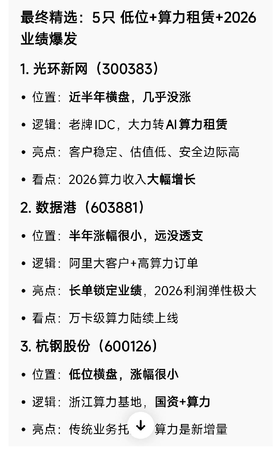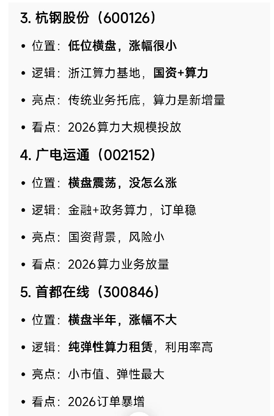 算力租赁大爆发!一批已涨5~10倍,下一批低位牛股浮出水面 2026年AI算力需求持续爆发,算力租赁已成A股最强主线之一。 以利通电子为代表的龙头,凭借万卡算力、大额订单,走出5~10倍超级行情,协创数据等头部公司也随百亿服务器投入迎来业绩与股价双击。 行情已明显分化,高位股风险加大,低位、正宗、业绩即将爆发的标的,才是下一阶段重点。 这批公司手握算力租赁长单,2026年产能集中释放,近半年横盘未涨,估值与涨幅严重滞后,补涨空间巨大。 核心逻辑不变:算力供不应求、价格上行、业绩高增。 抓住真算力、低位、高增长,就是抓住下一波算力牛股。