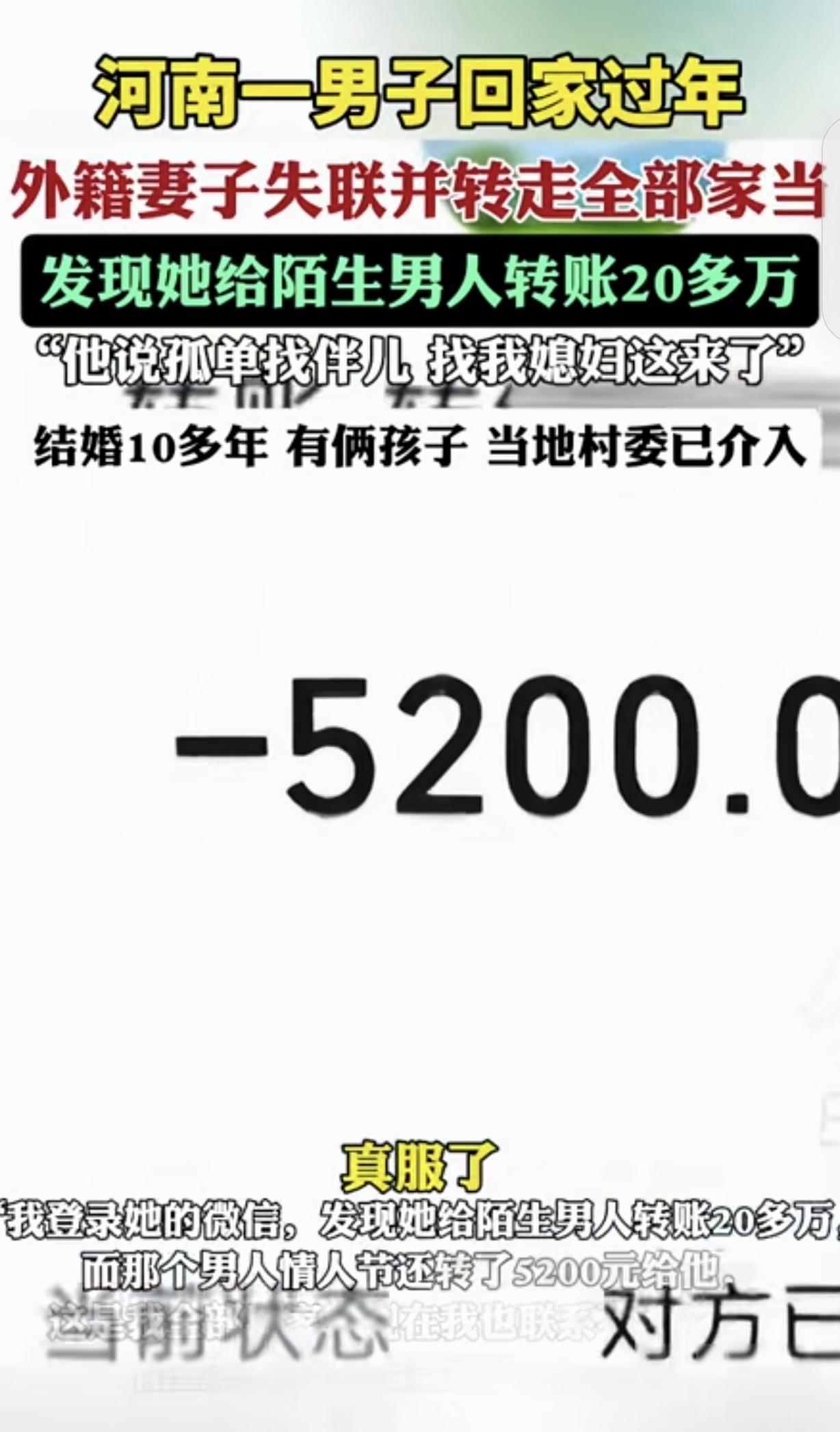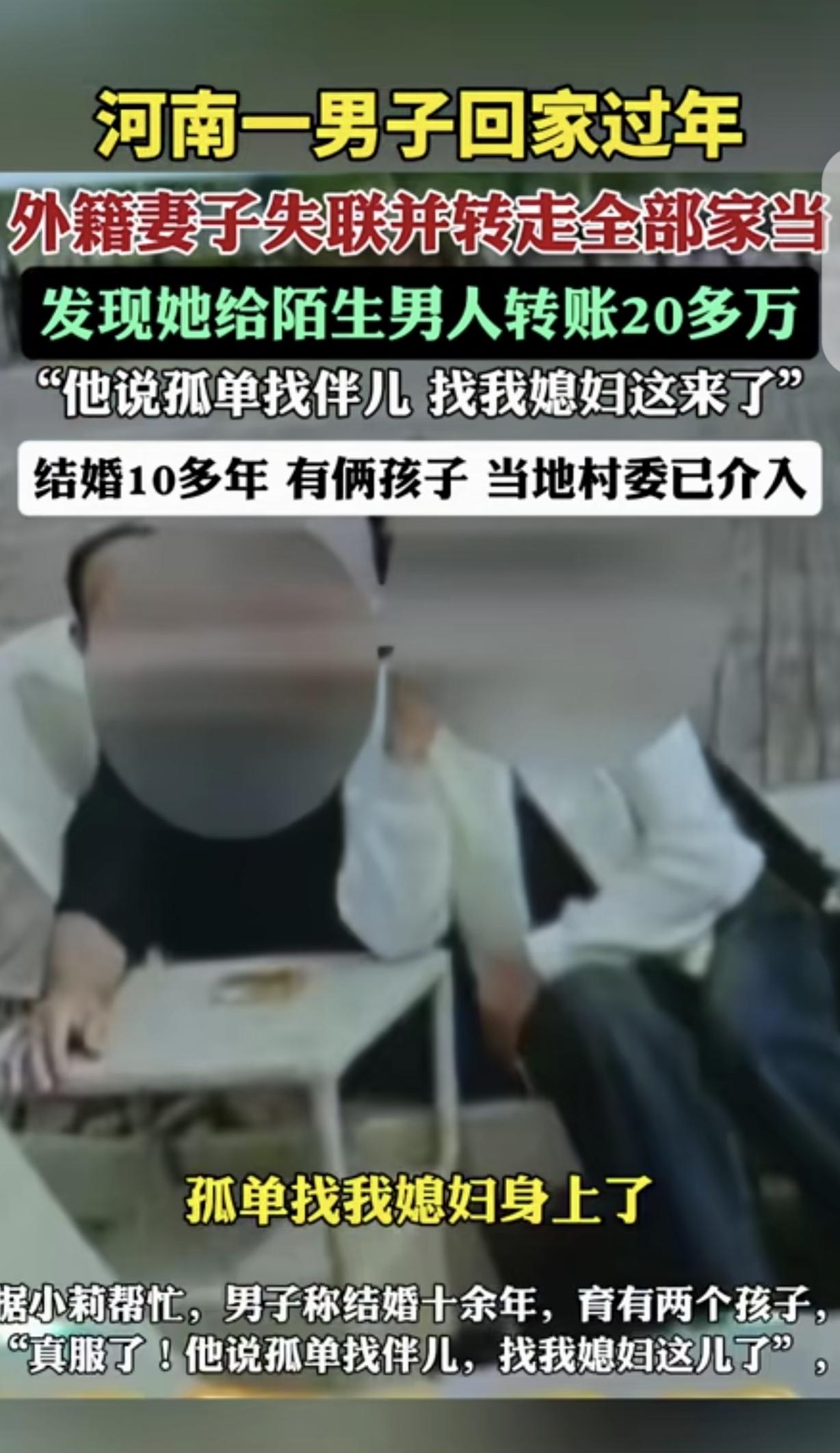 “外籍媳妇不靠谱!”河南济源,一男子娶了个外籍媳妇,结婚10年生了2个女儿,男子把挣的钱都给媳妇管,他打工回家过年,竟惊讶的发现,媳妇卷走全部家当跑了,男子登录媳妇微信,发现她给一陌生男人转账20万,男人情人节给媳妇转了5200,收钱男子朋友圈背景图是和妻子的亲密照,男子给对方打电话,对方却说他找错人了。真是人财两空呀!男子崩溃了,可奇怪的是,男子没有报警,当地村委介入了。网友:外籍媳妇靠不住,也养不熟。 李先生娶了个外籍媳妇,案例里没交代是哪国人,但大家猜测应该是越南女子。 结婚10年,生了2个女儿,一家四口生活幸福,李先生为了承担起养家糊口的责任,让媳妇嫁给自己有福享,让孩子们过好日子,他常年在外打工,只能春节回家过年。 李先生平时,一发工资自己不舍得花,只留下基本的生活费,其他的就转给媳妇,他是搂钱的耙子,让媳妇做管钱的匣子。 可万万没想到,2026年春节,他大包小包,带着给老婆孩子买的礼物回家过年,竟发现人财两空。 妻子竟然卷走他多年打工的积蓄,扔下2个女儿不知去向。 一定是自己不在家时,妻子发生了什么?否则她不可能这么狠心,不辞而别。 为了掌握媳妇的行踪,李先生登录了媳妇的手机却被惊出一身冷汗,媳妇竟然给一个陌生男人转账20万。 而这个男人在情人节也给媳妇转了5200元这个特殊数字,再加上乱七八糟的费用,一共转账大概30000多。 男子微信里写着,他很孤单想找个伴,朋友圈背景图,是跟媳妇的亲密合照。 媳妇竟然为了这么个男人,不顾他们夫妻10年的情分,不顾2个年幼的女儿,跟这个男人跑了? 李先生悲痛欲绝,他赶紧给这个男人打去电话,对方竟说李先生打错了,然后就挂了,再打也不接了。 不知道为什么,李先生没有报警,当地村委介入了,又不是夫妻闹了矛盾,村委调解,这种情况,不应该先报警吗? 有人说,外籍妻子?留守?还管钱?这男的心有多大!尽管我是女人,我也觉得男人的钱,不能全部都给女人。 不要找外籍媳妇。我同学他被骗彩礼,骗了十几万。生了个孩子后跑了。 男子唯有控制住自己挣的钱,方能够大体控制住家庭,你为甚要把几十万钱款,放心交与妻子呢? 非我族类其心必异,找个外国女性作妻子,很难不是身在曹营心在汉,给外国人当提款机。 这事说起来就是一场真心错付的悲剧。李先生在外拼死拼活打工,把血汗钱都交给媳妇,就为了让老婆孩子过上好日子,结果等来的却是卷款跑路,换谁都得崩溃。 不过他也确实有些大意,常年在外留守妻子管钱,本身就容易出问题,更别说还是外籍媳妇,在文化和情感上本来就容易产生隔阂。 至于为什么不报警,估计李先生心里还是抱有一丝幻想,说不定是想着妻子只是一时糊涂,怕报警之后彻底撕破脸,再无挽回的可能。 也可能是因为外籍媳妇身份特殊,怕报警之后流程复杂,担心两个年幼的女儿受到影响,毕竟她们已经没了妈妈。 村委介入其实也挺合理,邻里乡亲的,对情况比较了解,先从中调解,说不定还能劝回媳妇,给孩子一个完整的家。 那些说“非我族类其心必异”的说法有点太极端了,不能一竿子打死所有外籍媳妇,还是要看具体的人。 这件事更多的是夫妻之间长期分离导致的情感破裂,以及管理钱财不当的问题。 李先生的遭遇也给所有在外打工的人提了个醒,钱可以让妻子管,但不能完全撒手不管,要多和家里联系,及时了解家里的情况,避免类似的悲剧再次发生。 《刑法》第266条规定,诈骗公私财物,数额较大的,处三年以下有期徒刑、拘役或者管制,并处或者单处罚金。 如果该外籍媳妇以非法占有为目的,虚构事实、隐瞒真相卷走钱款,可能构成诈骗罪。 但李先生没报警,可能是认为属于家庭矛盾,希望通过调解解决,也可能对法律程序不熟悉。 对此,你怎么看?