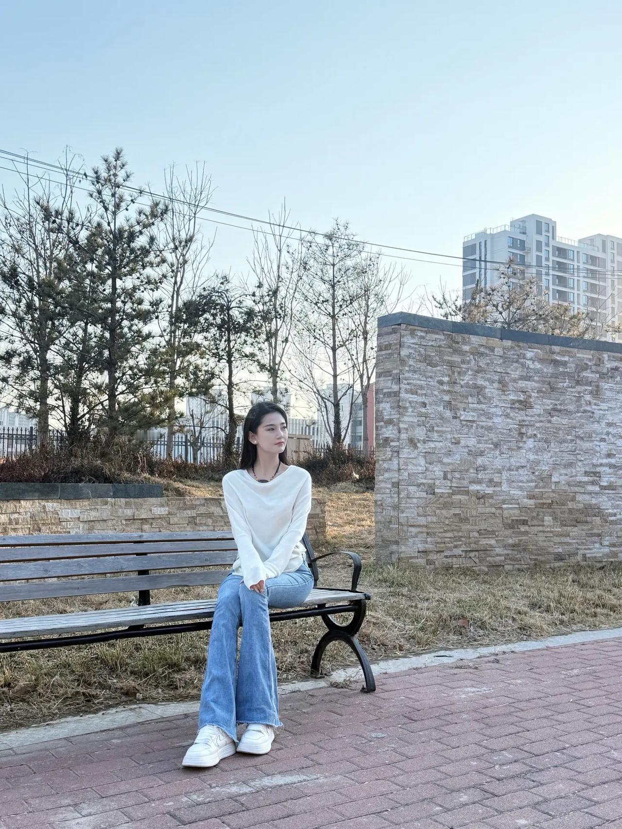 坐在长椅上,手拿小包,时尚休闲。
