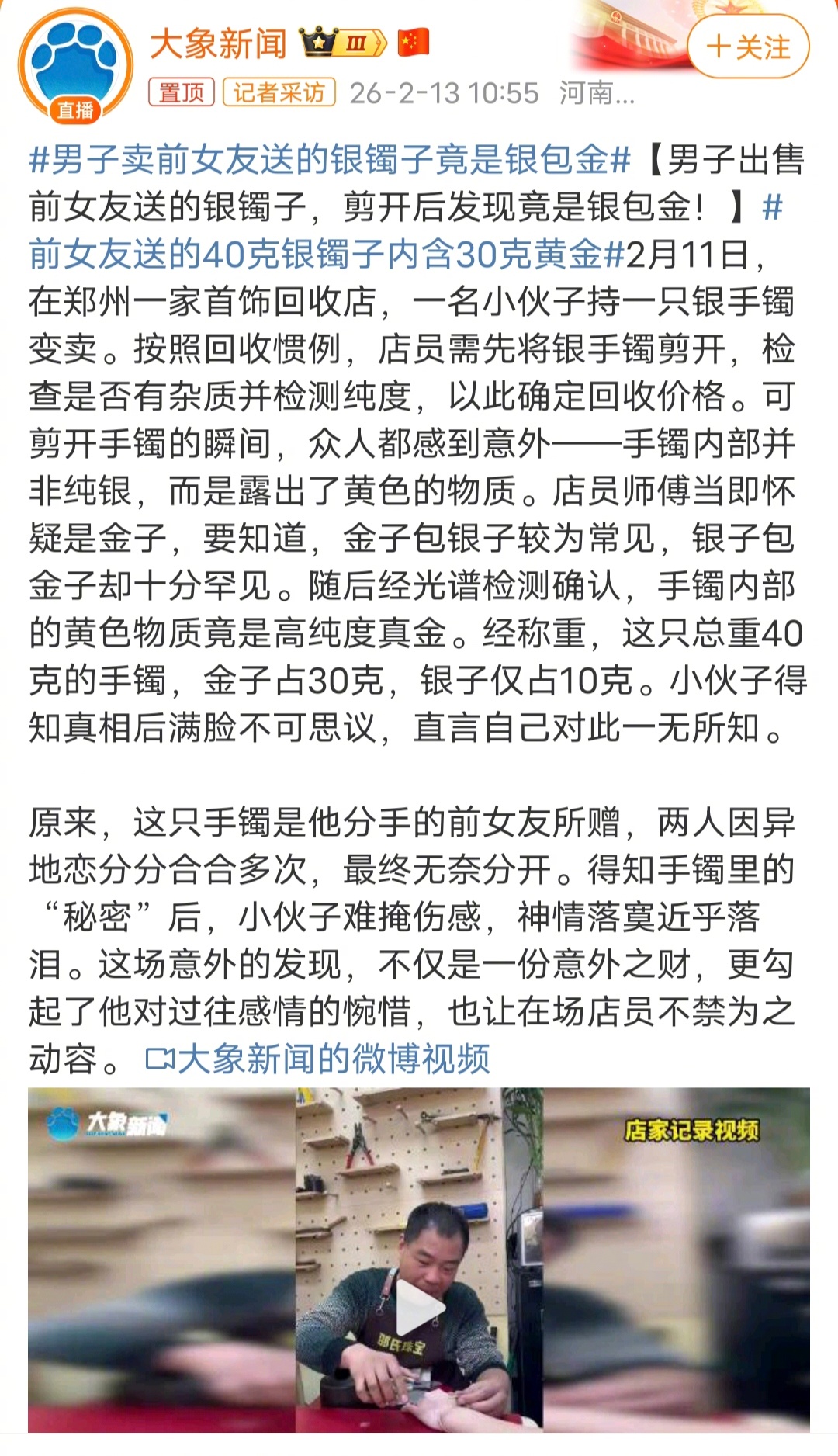 男子卖前女友送的银镯子竟是银包金真的不是摆拍吗???如果是真的,这个前女友可比具俊晔深情多了,这可是货真价实的银包金手镯,是银包金,可不是金包银,不过,还是感觉有点假,一般都是男的送女的手镯,哪里有女的送男的手镯的?很少会有男的戴手镯。前女友送的40克银镯子内含30克黄金