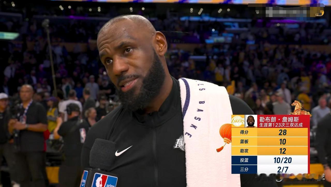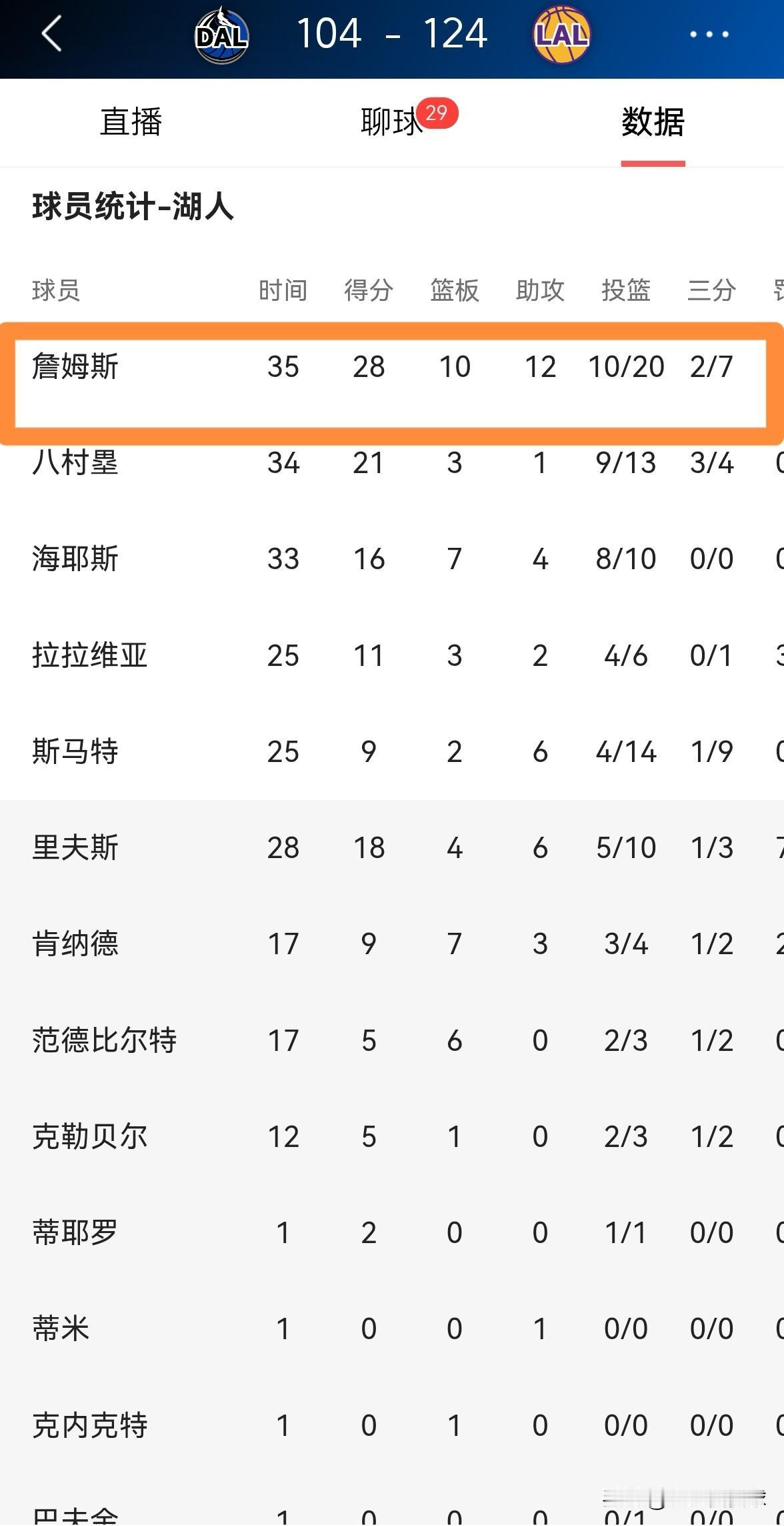我彻底的被湖人老将詹姆斯征服了!在今天湖人主场以124:104大胜独行侠的比赛中,41岁的詹姆斯豪取三双,成为了球队获胜的最大功臣。 全场比赛下来,詹姆斯首发出战35分钟,投篮20中10,其中三分球7中2、罚球7中6轰下28分10篮板12助攻1盖帽,没有出现任何的犯规,他的场上正负值为+6。 实事求是的说,当我亲眼目睹了詹姆斯的无解表现后,我彻底的被詹姆斯征服了。