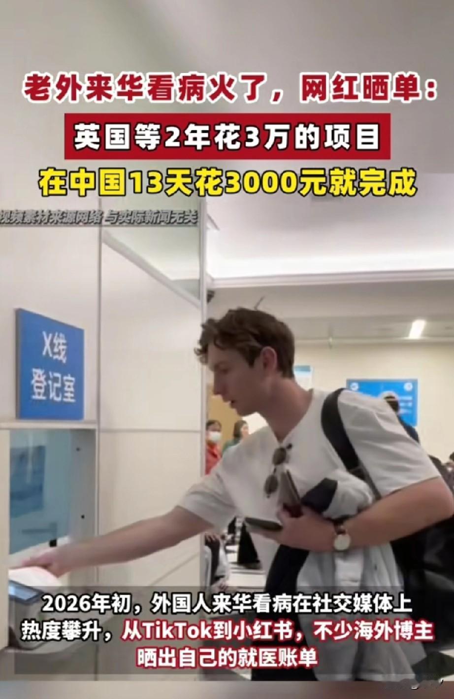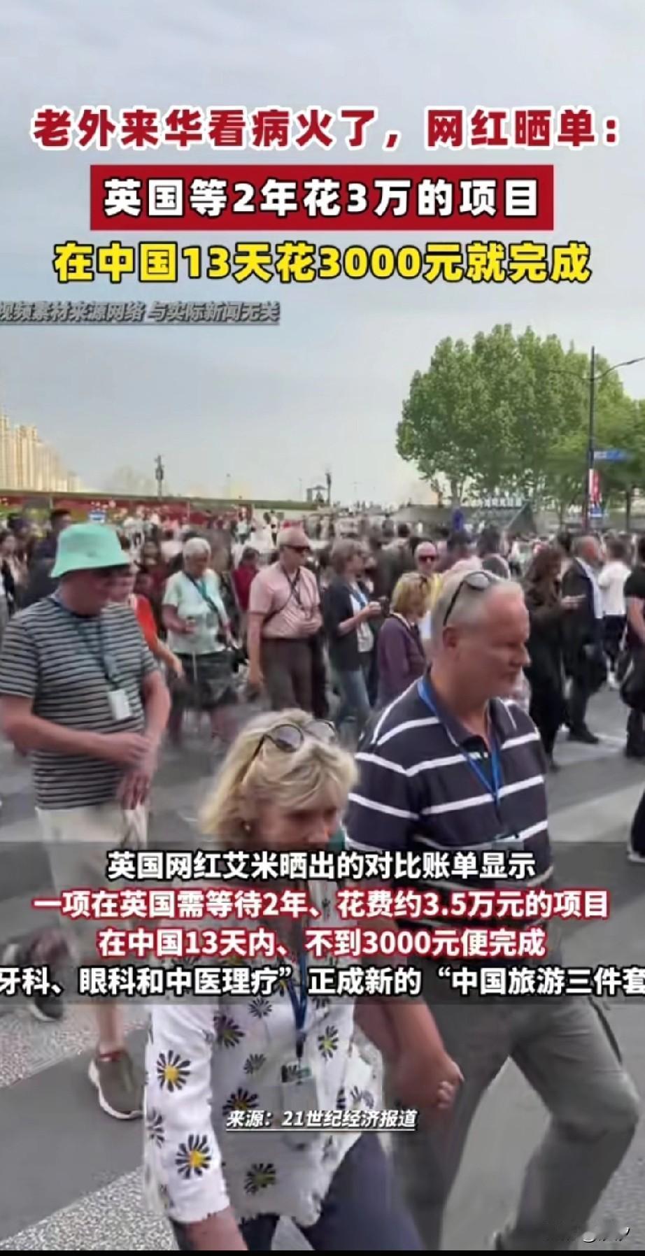 万万没有想到, 旅游签证来的了, 都来中国进行看病了, 有网红晒出了自己的账单, 英国等两年花3万的项目, 在中国只用13天,花3000就完成了, 这让她觉得不可思议, 她的分享直接在外网火了, 许多老外借助旅游签证来中国看病, 她们在国内看病非常贵, 来到中国成本非常低, 吃喝玩乐加看病别国外的医疗费用低太多,越来越多的老外组团儿来中国看病了,说白了就是对中国医疗资源的占用,这话反映了老外来华就医的本质, 本来是希望老外来中国促进旅游消费的,结果老外直接利用旅游签证逃离了医疗斩杀线,这么多的医疗难民, 正在疯狂的推动国内医疗事业的进步, 这是谁也想不到的, 大家欢迎外国人来华就医吗?