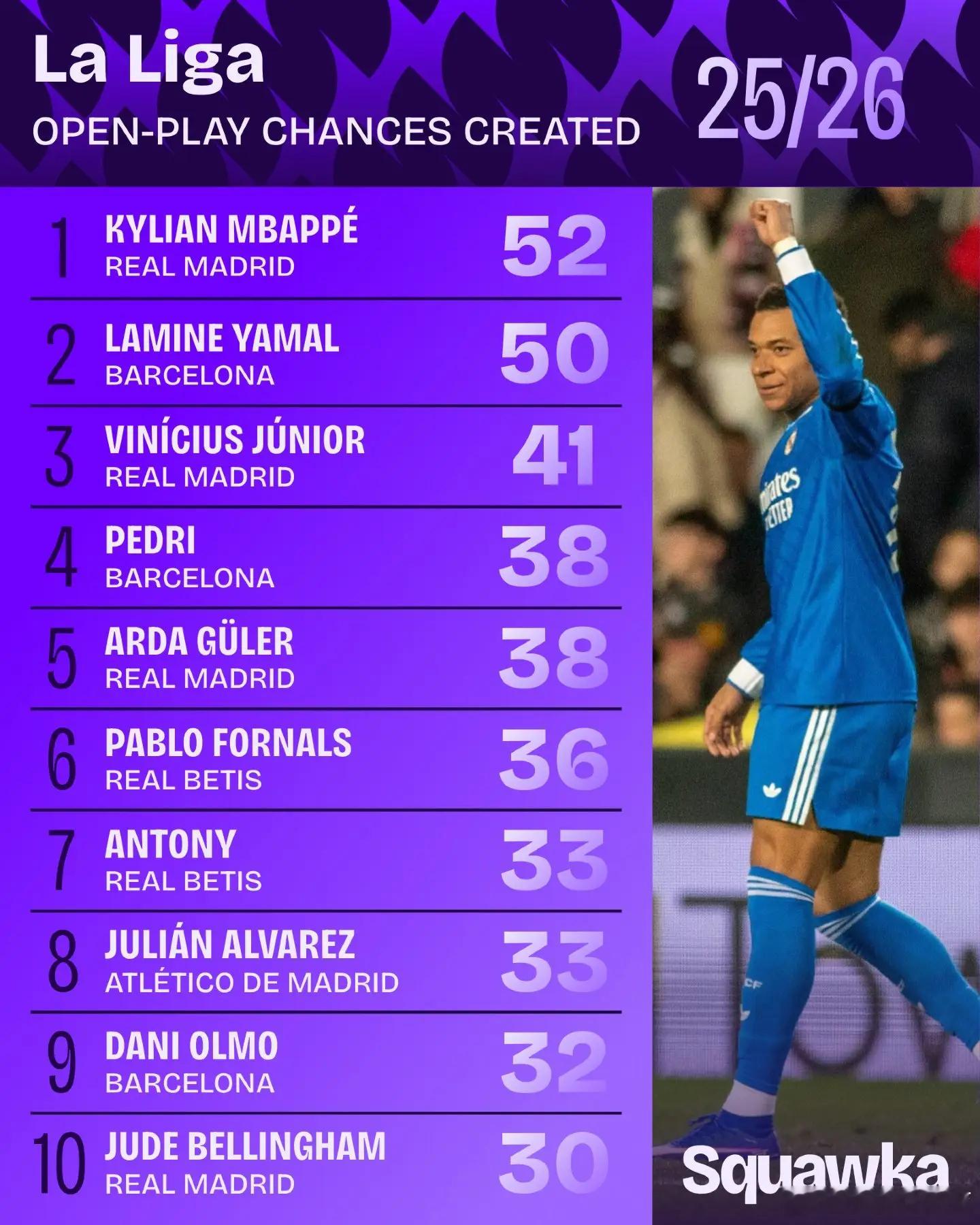Squawka公布了本赛季西甲运动战创造机会次数排名,姆巴佩亚马尔领衔,安东尼在列。具体榜单如下: