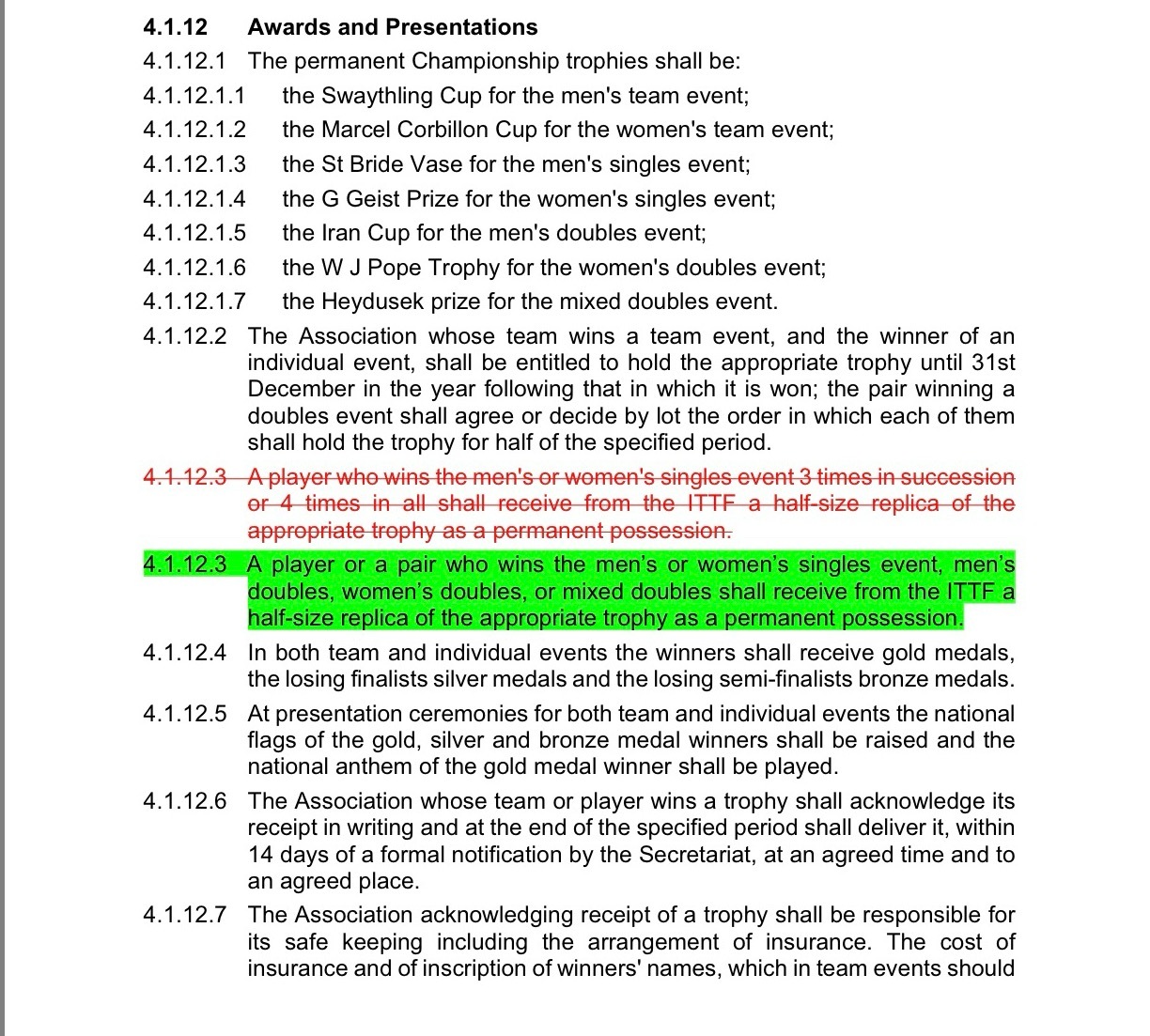 此前规则规定,连续三次或累计四次赢得男子或女子单打项目的选手,将获国际乒联颁发该奖杯的半尺寸复刻奖杯作为永久收藏。