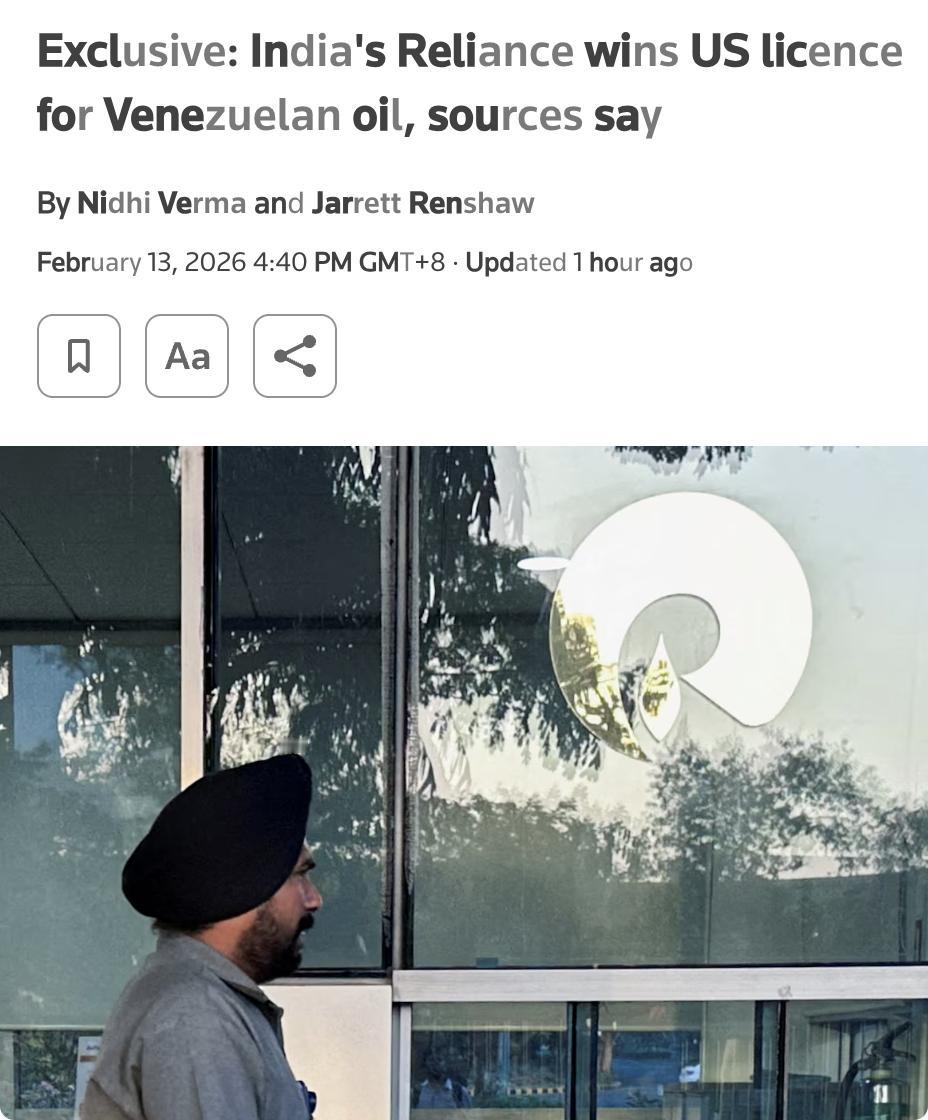 外媒:美国已授予印度信诚工业集团(Reliance Industries Ltd)一般许可,允许其直接购买委内瑞拉原油,而不违反制裁。 信诚于1月初申请该许可,此次许可将帮助其用委内瑞拉原油替代俄罗斯原油,降低原油成本。委内瑞拉总统马杜罗被美国捕获后,美国放松了对委内瑞拉能源行业的制裁,以促进委内瑞拉与美国之间达成20亿美元的石油供应协议及1000亿美元的石油行业重建计划。 信诚此前因美国制裁而停止购买委内瑞拉原油,此次许可将加速委内瑞拉石油出口,降低信诚运营全球最大炼油厂的成本。