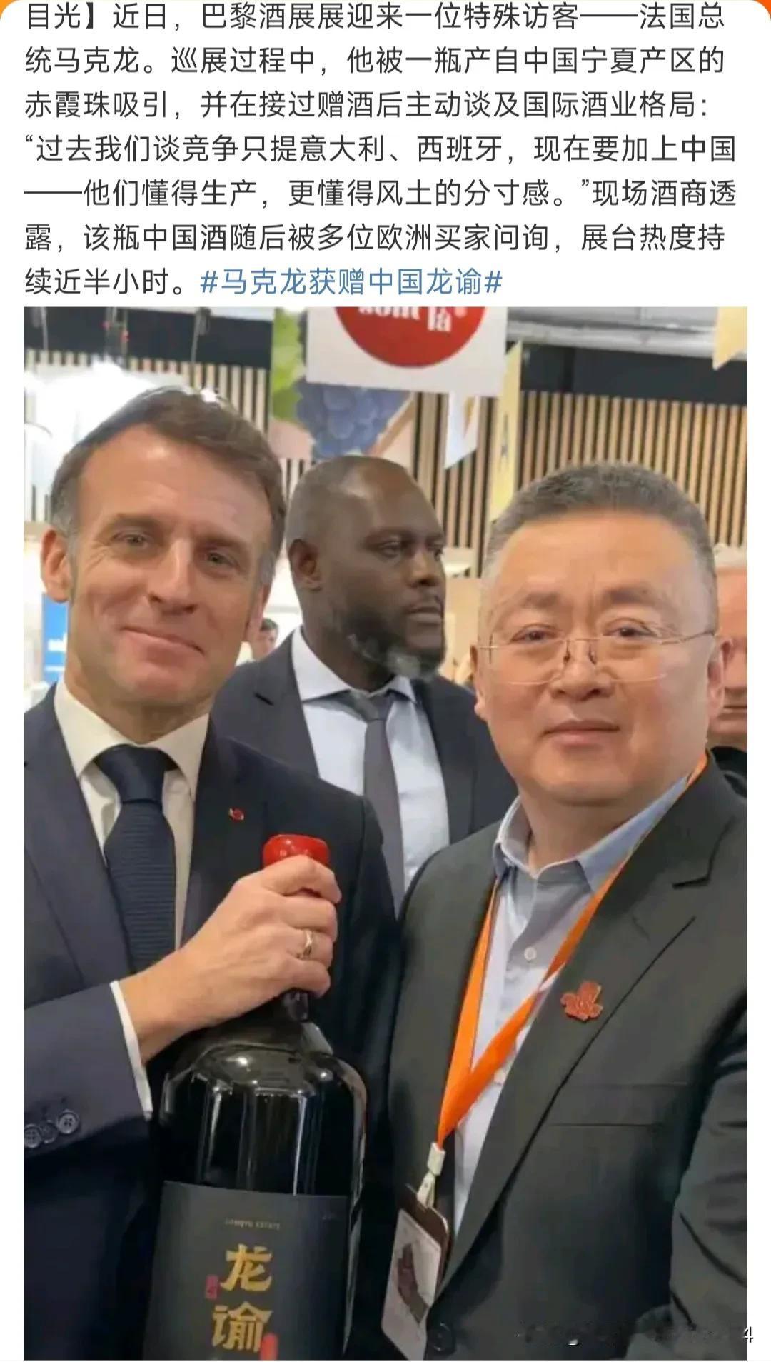 西方政客还是挺懂人情世故,看眼色的! 最近,在全球最大的葡萄酒展上,马克龙公开称赞中国“龙谕”:“过去谈葡萄酒竞争只提意大利、西班牙,现在必须加上中国——他们懂得生产,更懂得风土的分寸感。”随后该瓶产自宁夏的赤霞珠便成为全场“最亮的崽”,被众多欧洲买家抢购! 据悉,马克龙非常懂红酒,还曾参加过“盲品挑战”,整体表现接近专业酒评人士。 网友:中国红酒也走上了世界舞合,能够得到外媒主流的聚焦报道,已是一次小小的胜利。 (信源:南风窗)