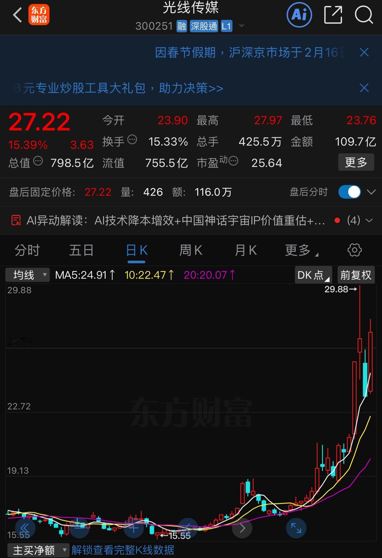 炒股有时候确实需要点魄力。 盯了光线传媒近半个月,迟迟不敢下手,眼见着春节行情错过,好不容易等到光线深度回调-12.17 %,还是在农业银行和光线传媒两个股中选择了农业银行。 今天这反差,一个继续下跌-1.51 %,领跌四大行。而光线传媒却在四千个股下跌的情况下,逆势大涨15.39 %! 终于休市了,蛇年过去,马年再战!