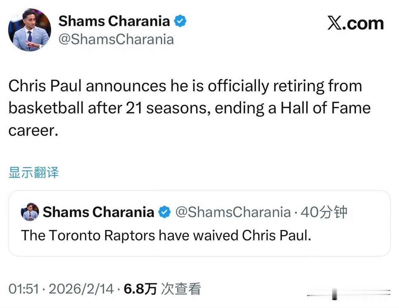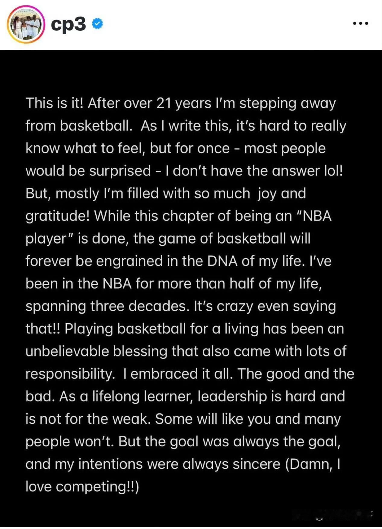 突发!!!克里斯-保罗宣布退役!!! 根据记者Shams最新消息透露,猛龙官方宣布他们裁掉了老将后卫克里斯-保罗,在随后1小时左右,保罗宣布退役,并发长文告白结束自己21年的篮球职业生涯。 老炮最终还是选择了离开,这是他目前唯一的选择,当然以这样的方式离开或许有些不体面,但是每个球员职业生涯也各有不同,这也和球员自己的选择有关。 保罗表示:就到这吧!在超过21年后我选择了离开,写下这些的时候,我无法形容自己内心的感受。保罗用一篇煽情的文章告诉大家他此时此刻的心情以及整个职业生涯都保持竞争的心态。 保罗的退役也代表了一个选秀时代的终结,虽然终身无冠,但是他的职业生涯足够丰富,荣誉也是相当多,祝福他一切顺利。天南地北大拜年 保罗 克里斯·保罗 克里斯保罗