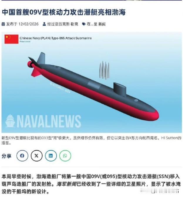 美媒:中国首艘095攻击型核潜艇下水了!? 东大领先世界的大黑鱼终于来了,它就是水下055。 有消息称,095 型攻击型核潜艇的水下排水量稳定在 9000 到 10000 吨区间,这个吨位放在全球现役攻击型核潜艇里属于标准的先进配置。 大洋彼岸的媒体圈泛起了一阵躁动,焦点直指中国下水的首艘095型攻击核潜艇,对于美国海军而言,这不仅是一条新舰入列的消息,更像是一个信号。 在大洋深处,那道曾经泾渭分明的噪音“红线”,正在变得模糊,声呐兵屏幕上,那片令人不安的空白,意味着对手已不再是图纸上的假想敌,而是真切存在的深海幽灵。 这艘排水量估算在9000至10000吨的深海巨兽,标志着中国潜艇设计思路的一次重大转折,某种程度上,可谓是工程哲学上的“断舍离”。 它摒弃了苏俄流派中标志性的“双壳体”结构——这种虽然拥有极高储备浮力、能抗揍的设计,却因复杂的内部支撑结构,容易产生流体噪音且严重挤占内部空间。 095型果断转向了西式的“单壳体”构型,这种“以隐身换抗沉”的取舍,通过减少湿表面积和优化流线,直接换来了内部设备容量的扩充,和水动力噪声的大幅降低。 这种设计上的大刀阔斧,直接体现在了声学特征上,据悉,其噪音水平已压低至95分贝以下,这在充满背景杂音的大洋深处,几乎等同于隐形。 配合取代了传统螺旋桨的泵喷推进系统,095型不仅消除了,高速航行时的空泡噪音这一传统短板,更让其静音能力,追平了美军现役主力的弗吉尼亚级,令对手引以为傲的反潜声呐体系,面临严峻的识别挑战。 在机动性与勤务性上,新艇同样展现了细节上的考量,尾部采用的X型舵面设计,不仅提升了潜艇在浅海复杂水文环境下的操控灵活性,更具备了在坐底待机时的结构优势,避免了传统十字舵易受损的风险。 而在动力核心方面,实现了“艇堆同寿”的技术跨越,意味着在长达几十年的全生命周期内,无需进坞更换核燃料。 这省去的不仅仅是数年的大修时间,更意味着舰队,在任何时刻都拥有更高的在岗率,这在战术上,等同于凭空增加了兵力规模。 而095型的威慑力远不止于“安静”,其垂直发射单元中集成的鹰击-21高超音速导弹,拥有超过1500公里的射程,和末端6至10马赫的极速,这彻底改变了攻击核潜艇的作战半径和角色定位。 它不再局限于单纯的蹲守伏击,而是具备了对陆纵深打击和远程“点穴”航母的战略能力。 外界将其称为“水下055”,并非空穴来风——正如055大驱在水面撑起防空伞,095型则在水下编织了一张兼具攻击与感知的网。 这种9000吨级的平台,容纳了海量的传感器阵列和算力中心,使其成为了深海作战的信息节点,填补了航母编队在水下的最后一块拼图。 长久以来,美国海军习惯了凭借技术代差,建立起的“单向透明”优势——即“我能随时监控你,而你对我一无所知”。 随着2026年095型的入列,这种轻松的深海游戏规则宣告失效,美媒此刻的焦虑,实则是对失去绝对水下控制权的本能反应,因为从这一刻起,大洋深处的博弈真正回到了同一起跑线。