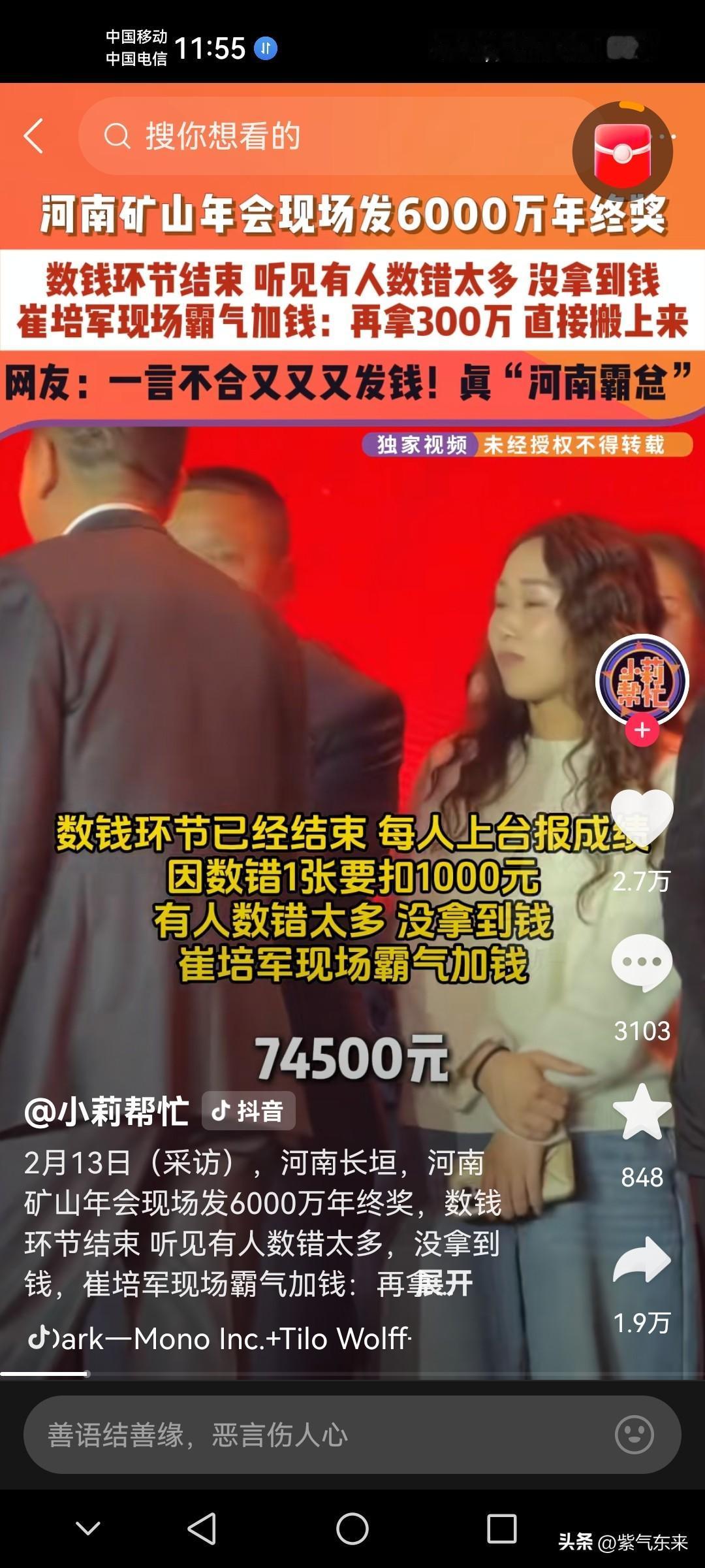崔培军真不愧是“河南霸总” 让员工数钱数到手抽筋,这句话在河南矿山年会上得到完美展现! 每年的河南矿山年会,就是一场豪宴盛会,堆积如山的现金,让在场员工无不动容! 这才是河南企业该有的格局,也活该河南矿山集团发财! 崔总在年会上听说员工数钱太快,导致没有拿到钱。崔总霸气说到:再拿300万现金! 让员工的幸福感拉满! 这样的企业是无数打工人梦寐以求的! 企业招聘63个技术岗位员工,结果应聘人数达到惊人的1000多人! 河南矿山让员工体会到了真正的幸福感和自豪感! 崔培军好样的!河南矿山宴会 崔培军 河南矿上老板 起重集团崔老板
