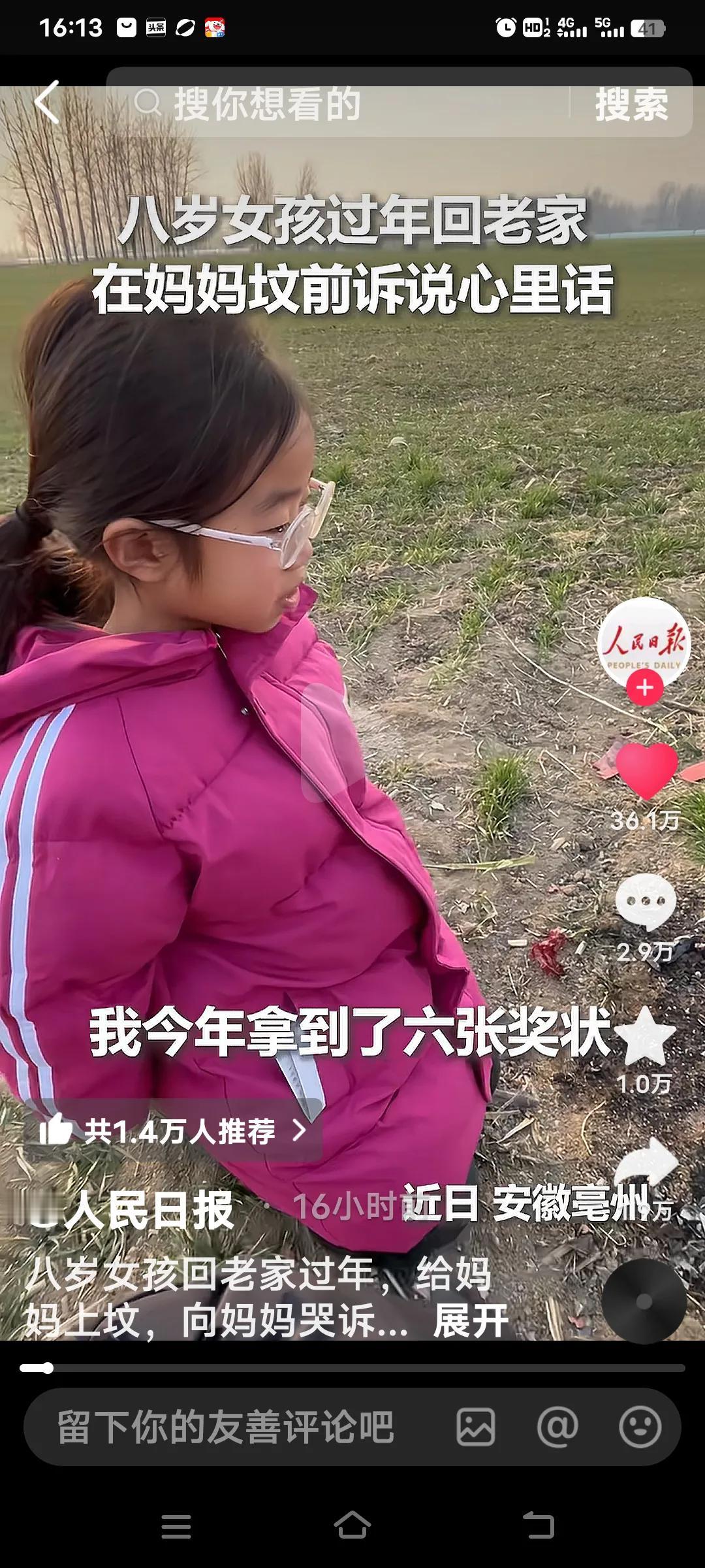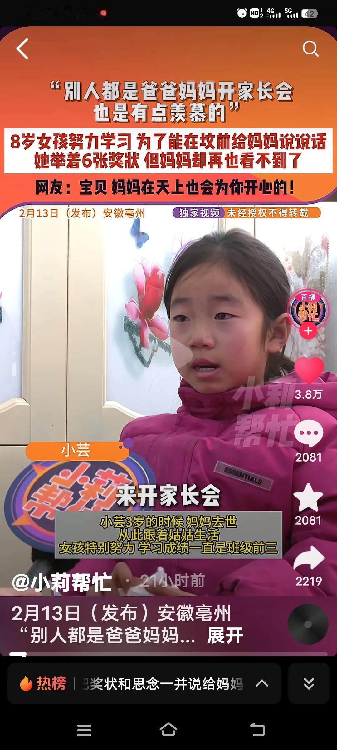 2026年2月12日,安徽亳州一处坟前,8岁女孩捧着6张奖状哭诉的画面,感动无数网友。 女孩3岁时妈妈离世、爸爸也不在身边,一直由姑姑照料。她辛苦一整年拿到6张奖状,有三好学生奖等,可妈妈却看不到。 她羡慕同学拿奖状后有爸妈在校门口迎接、回家庆祝,而自己只能对着妈妈的坟诉说。她烧了写满心里话的纸条,盼妈妈收。 这一幕让不少网友看了流泪了,一个八岁的孩子太懂事了。祝你快快长大,将来做一个对国家有用的人,同时也好好的孝敬你的姑姑,只能对妈妈的爱留在心里面!人活一辈子,什么是真正属于你的 为祖国说一句心里话