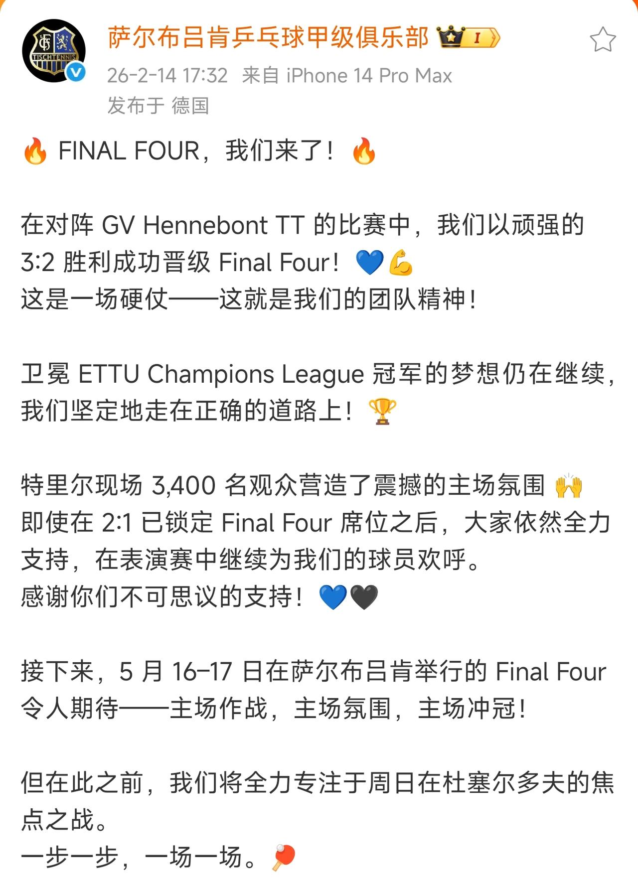 #条友这一周# 樊振东最新赛程出炉!明晚8点打德甲,中国观众不用熬夜 今天凌晨,太多中国观众是熬夜观看了乒乓球欧冠比赛,樊振东领衔的萨尔布吕肯vs温瑞博领衔的亨尼邦。虽然樊振东输了两局,但是其他队友给力,萨尔布吕肯还是成功杀进欧冠4强。晚上,萨队官方也是特意发文庆贺 接下来,萨尔布吕肯将全力专注于联赛。2月15日晚,也就是明晚的20点,萨尔布吕肯将迎战杜塞尔多夫,期待樊振东打出好成绩 来到萨尔布吕肯后,小胖状态很好,笑容灿烂,和全队队友都成为了好朋友。在这里,小胖已经帮助球队斩获德国杯冠军,接下来,萨队将向欧冠和联赛发起冲击 加油,樊振东