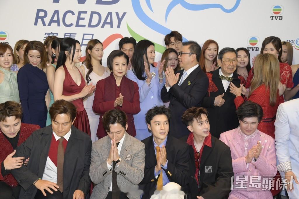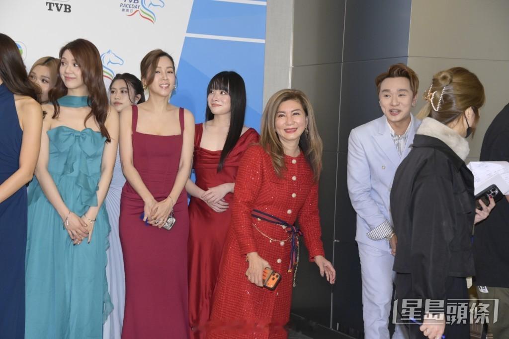 而“阿姐”汪明荃则以一身喜庆的红色套装亮相,贵气十足。作为TVB的“镇台之宝”,阿姐尽显敬业精神,全日无惧日晒,在场内四处走动。她全程笑容满面,对于宾客的合照要求更是来者不拒,亲民作风大受欢迎,足见其崇高地位。