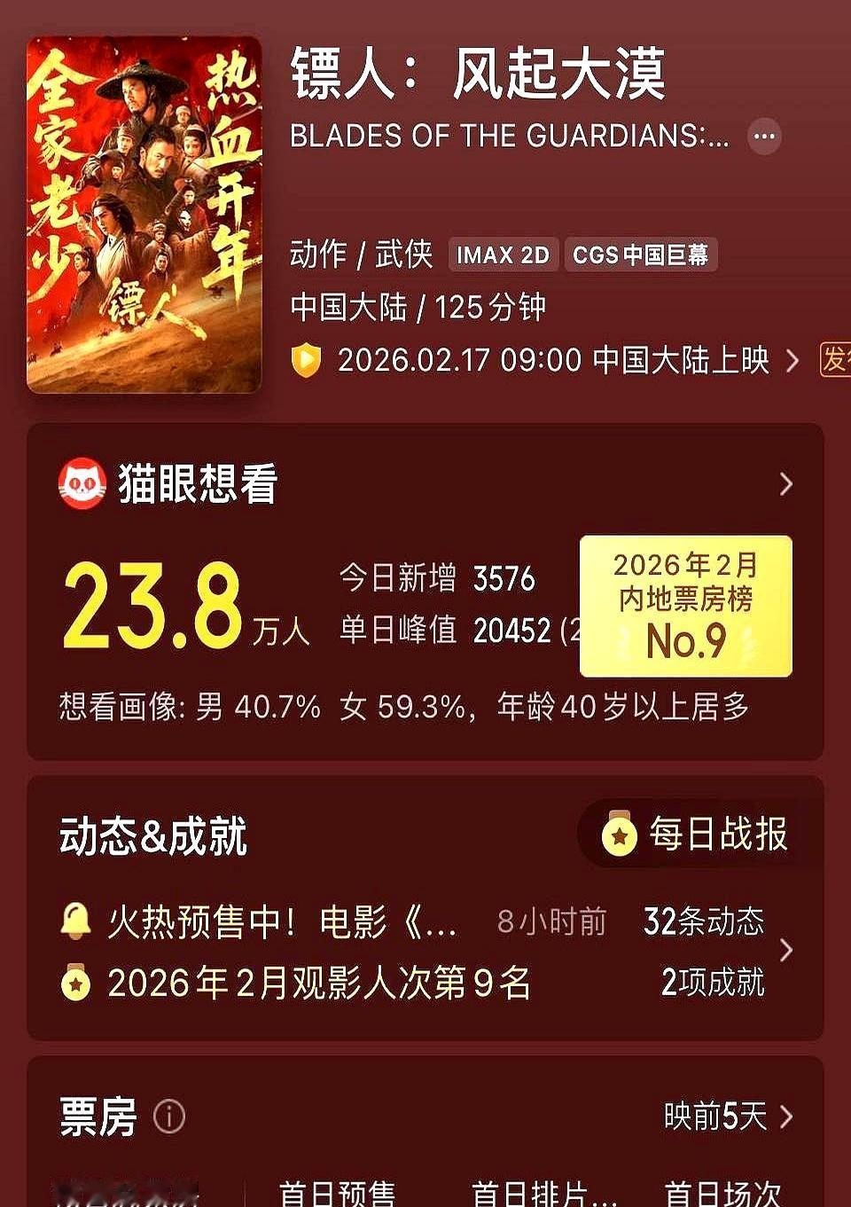 投资8个亿,预售票房才2700万,吴京这次怕是要栽个大跟头。 眼看沈腾的《飞驰人生3》预售快破亿了,吴京的《镖人》连3000万都没到,排片也被挤压到只剩17%,被甩开一大截。 这片子成本太吓人了,有说吴京自己都抵押了房产投钱,奔着7个亿去了。 按分账规矩,票房没个20亿连本都回不来。 春节档大家都想看合家欢图个乐,吴京非要上硬核武侠,真刀真枪的。 这回是观众变了,还是吴京赌错了?