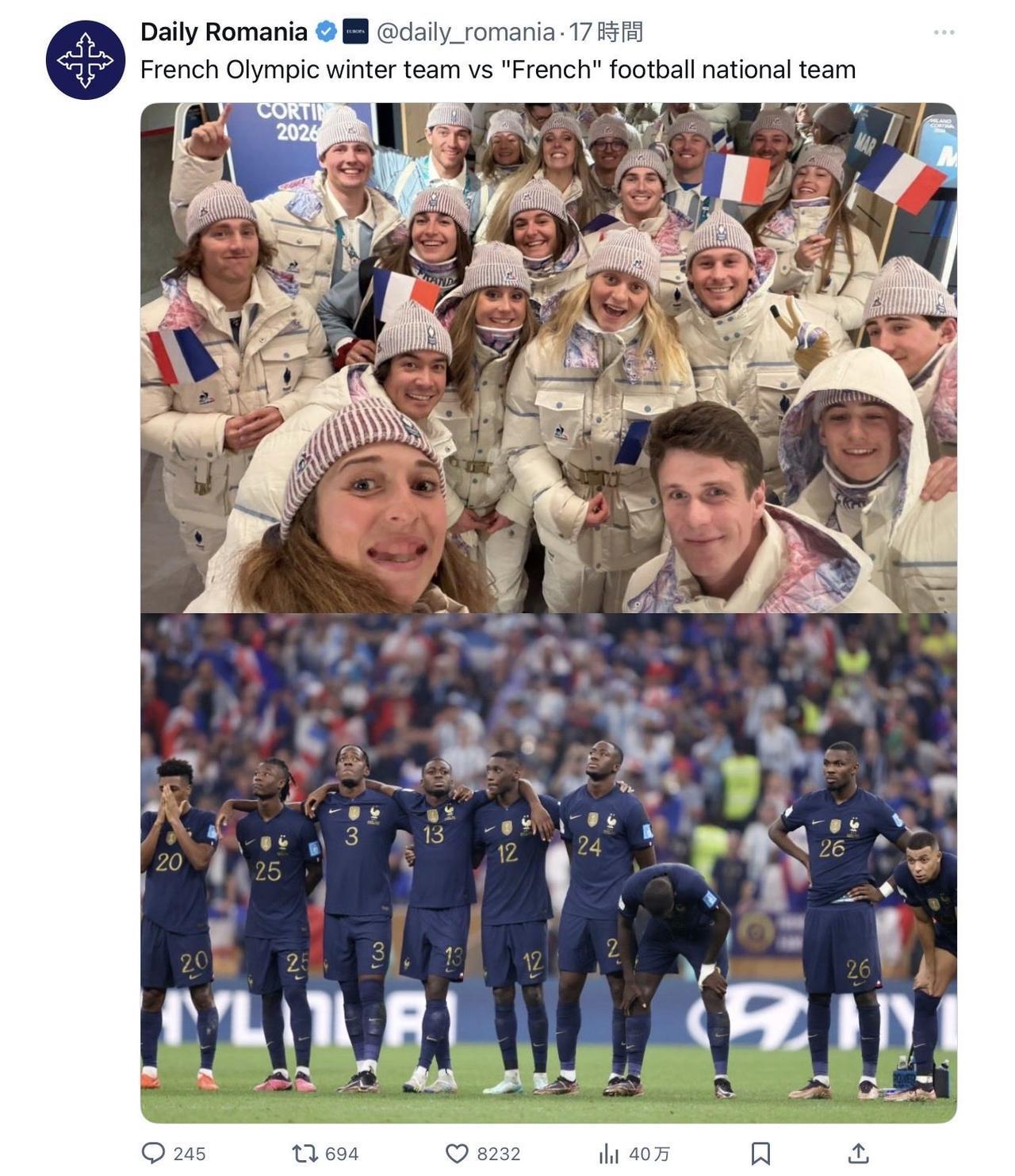 法国人发了张图片,他们冬奥代表队是白人,足球国家队全是黑人。 这就对了,黑人怕冷,足球更普及更热门,所以黑人都踢足球,把白人位置抢走。 滑雪等项目,只有白人参与,尤其是北欧那边盛行,南方国家很少参与。 法国这样很正常。[大金牙]