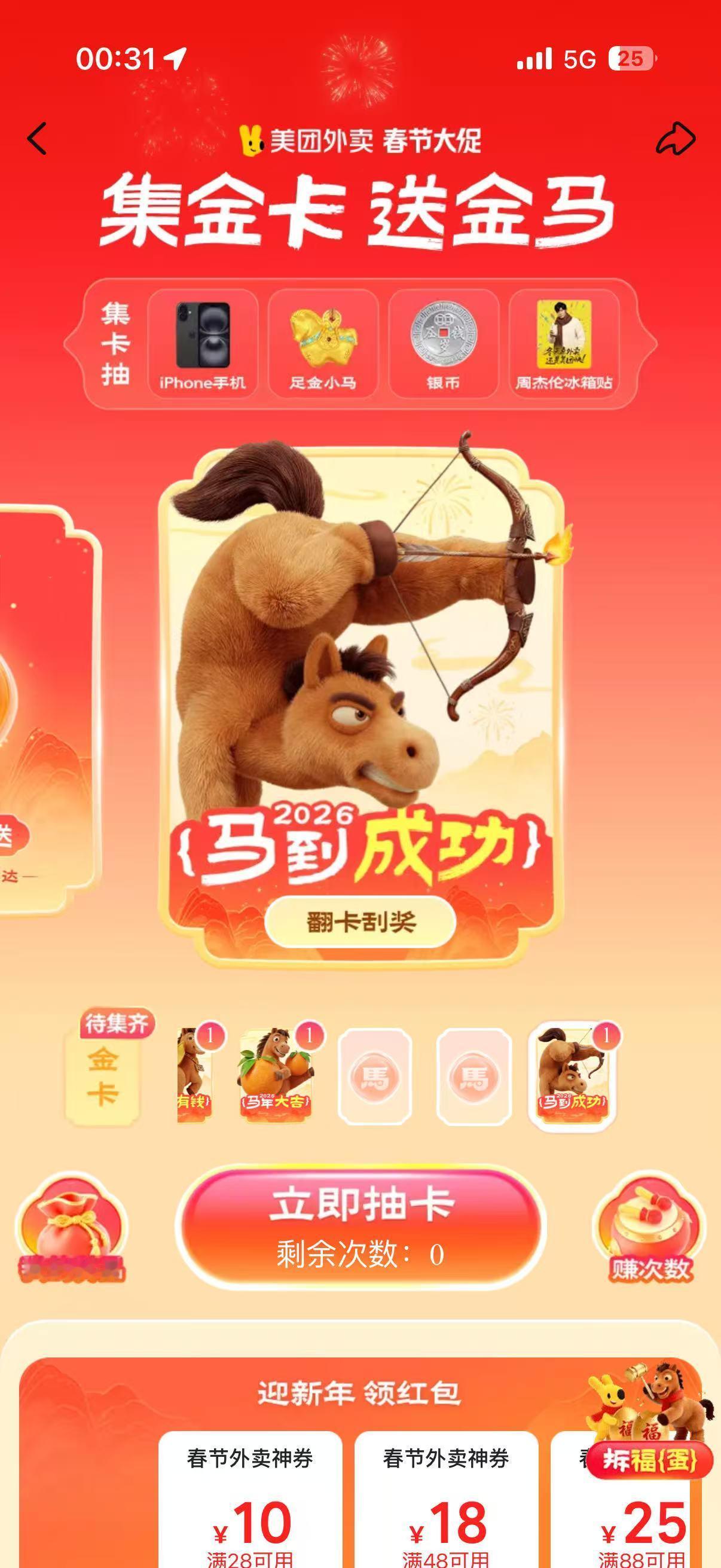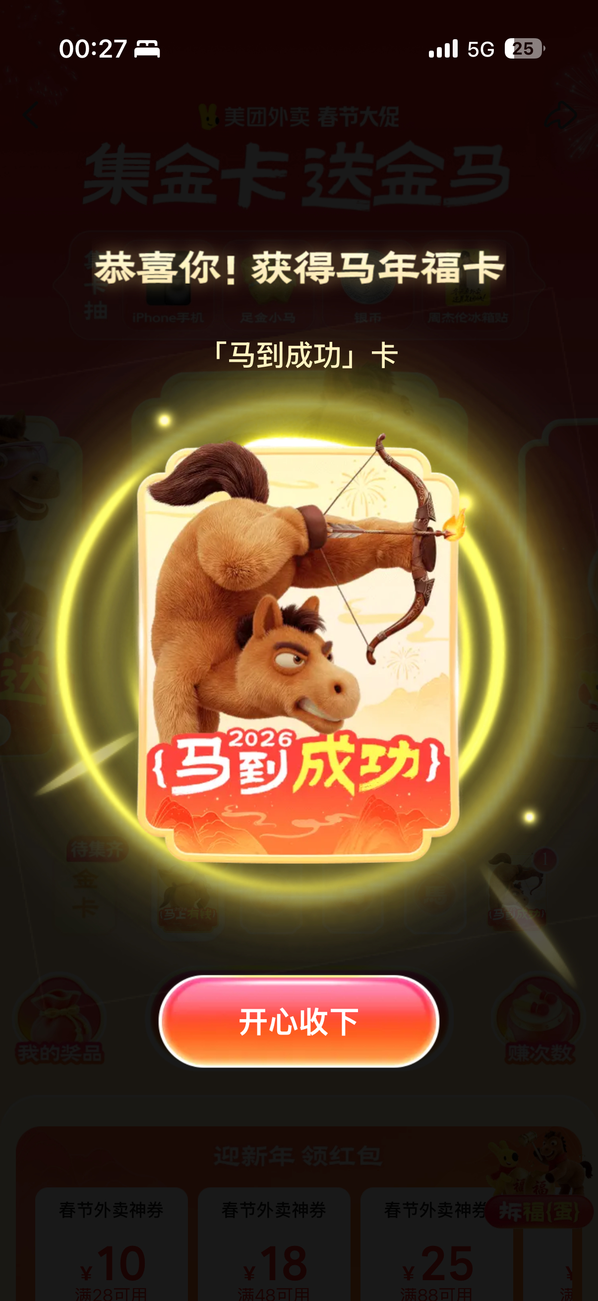 马年的新年仪式感,不必复杂,一件好物就够美团外卖集金卡送的金马,就是刚刚好的那一份!金马是马年专属的吉祥印记,是新年里一份稳稳的“金”喜轻轻巧巧,却把新年的氛围感、仪式感全都拉满集卡的过程是期待,抱回金马的瞬间,就是新年最有心意的小圆满🗓️2.15-2.23🔎美团外卖搜【集金卡】用一份金马,开启一整年的好运与吉祥美团外卖送金马啦