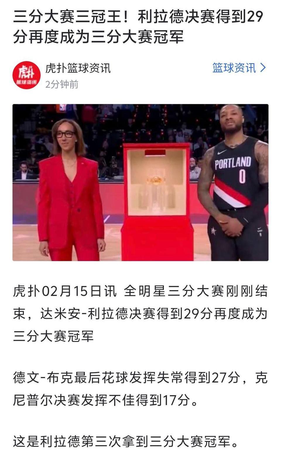 利拉德有三次三分大赛冠军,这也是传奇纪录了。 可惜他追求总冠军失败,回开拓者很难拿冠军。 但是他的三分球不比谁差,这么多三分冠军就是证明。[大金牙]