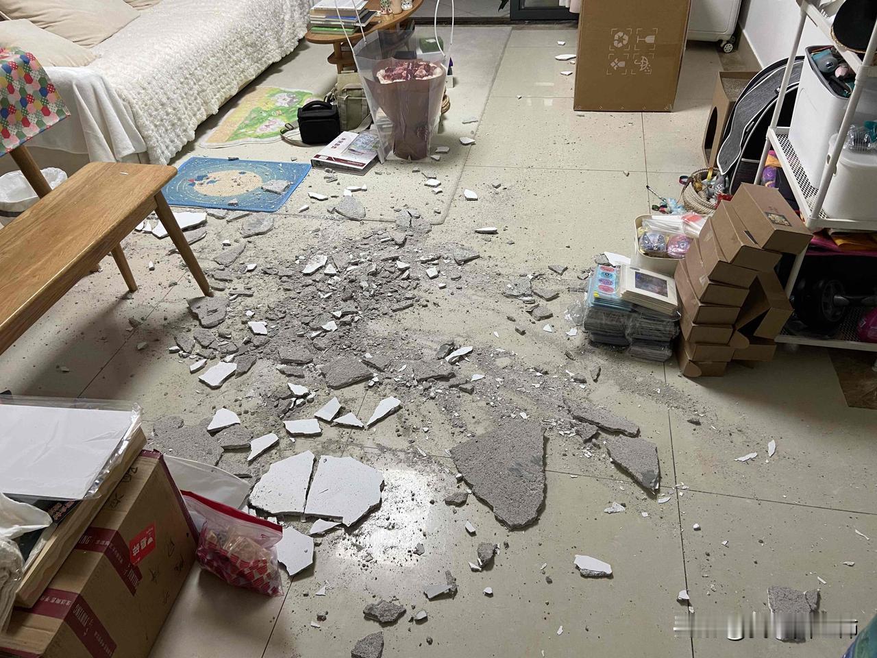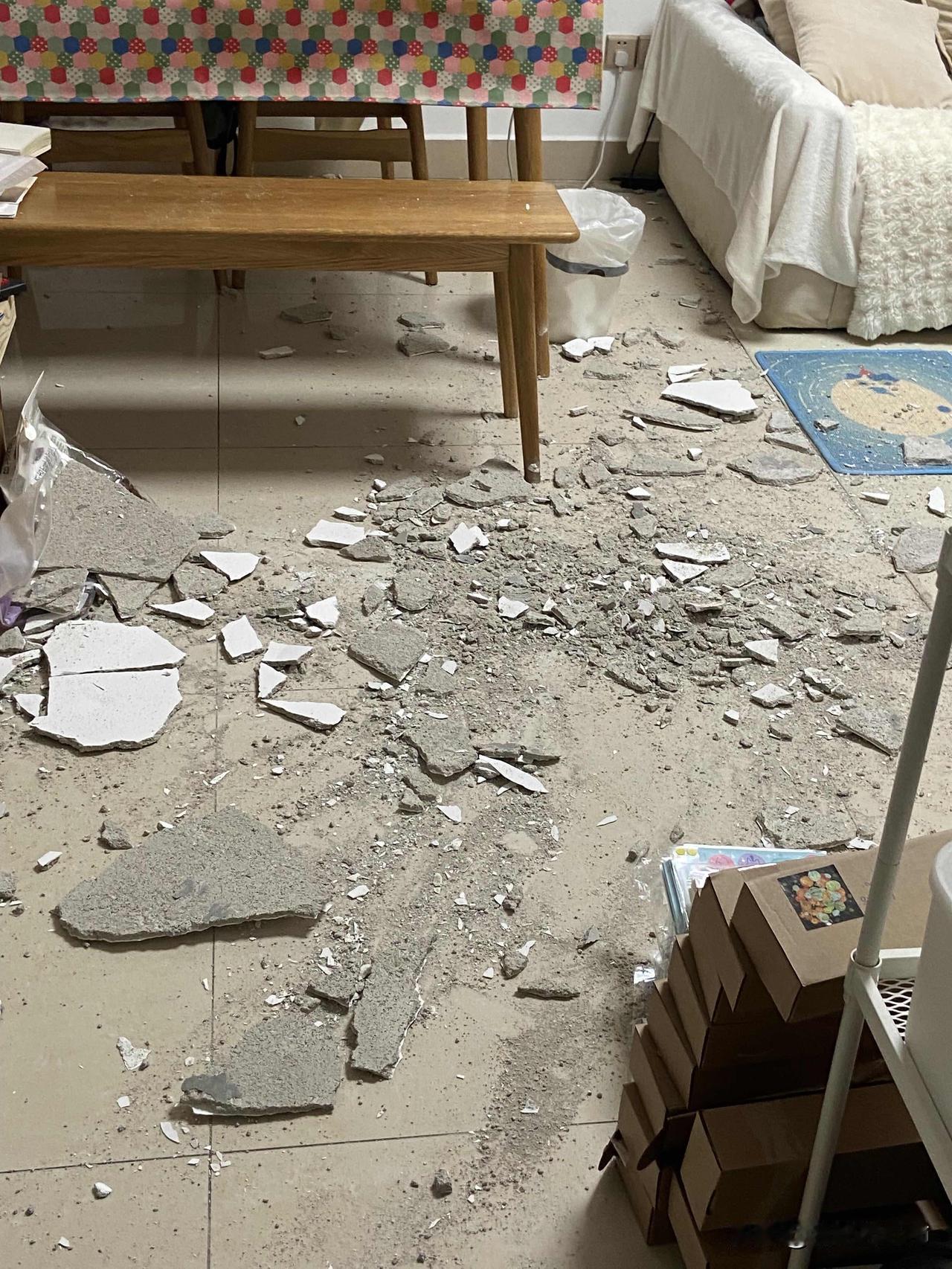 楼上装修,天塌了,这年还能过吗 逛完花街回到,字面意义上的天塌了,天花板腻子脱落,掉落的位置下方就是每天画画的位置,不幸中的万幸是今日不在家,人没事,猫猫也没事(但是有点应激) 1月份楼上装修多个电钻同时开工,从早打到晚连续几天,第一天就跟地震一样实在无法办公,出去躲了一天,回到家发现客厅和阳台天花板开裂,房间墙体脱落,立刻联系物业、上楼警告施工人员在物业工程师傅来到前停止装修,师傅懒得鸟我直接门一关继续开干,遂报👮♀️,第一次报👮♀️,在👮♀️面前和楼上业主对骂,警察协调后业主承诺会修复天花板,对方说装修工具合规,之后几天还会继续打钻,去图书馆办公躲了几天,每回到家看到家里墙体又脱落一些➕楼上轰隆的电钻声就无奈的崩溃大哭,后续几天在朋友的帮助下梳理证据准备维权的流程,就这样暂时相安无事的过了一个月,今天出去逛了半天的花街,晚上回到家里就酱紫了,哭不出来了,气也没力气气了,第二次报👮♀️ 今年依然是不回家的一年,可是这年还能好好过吗。 打完字眼泪又掉下来了