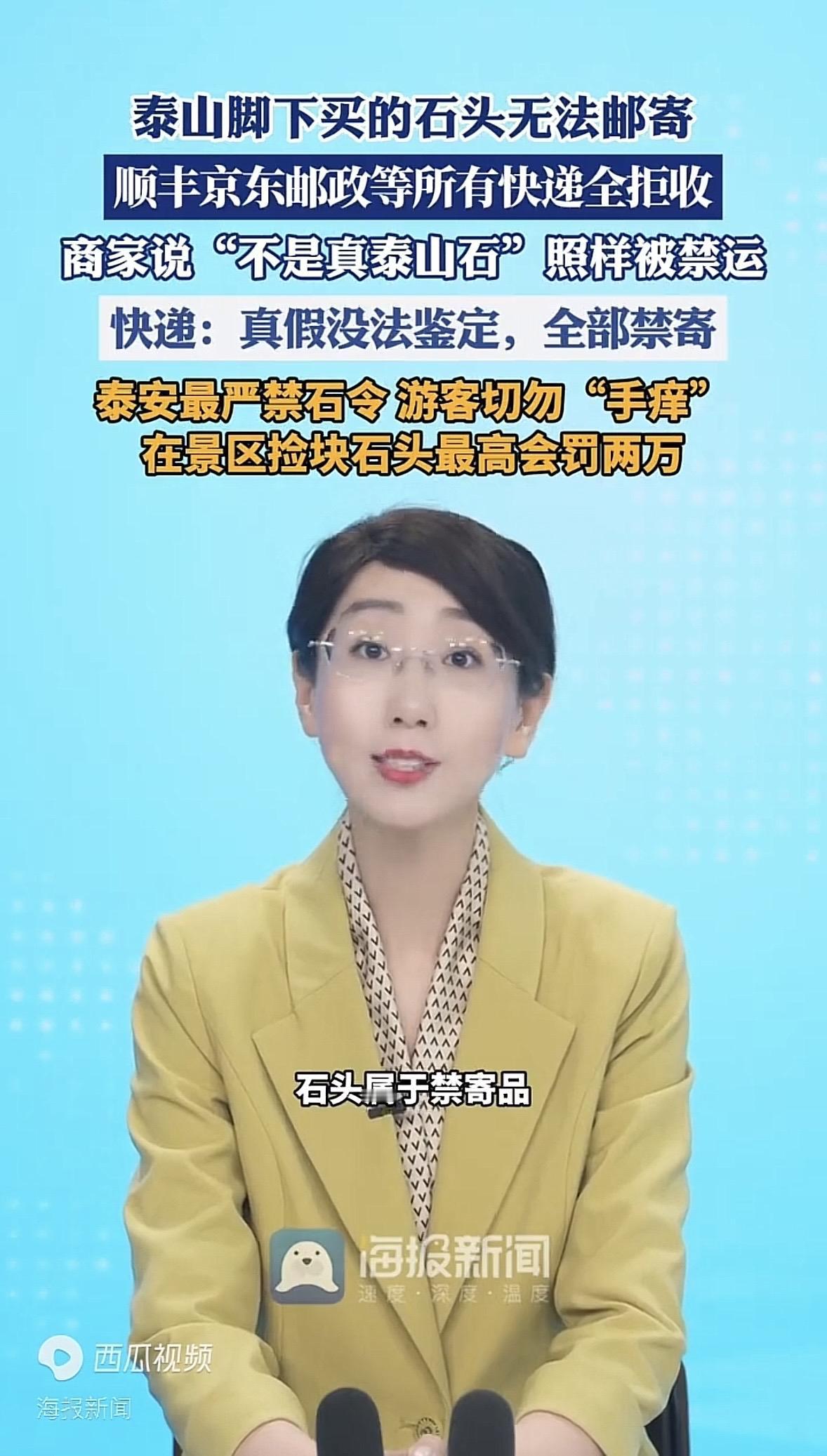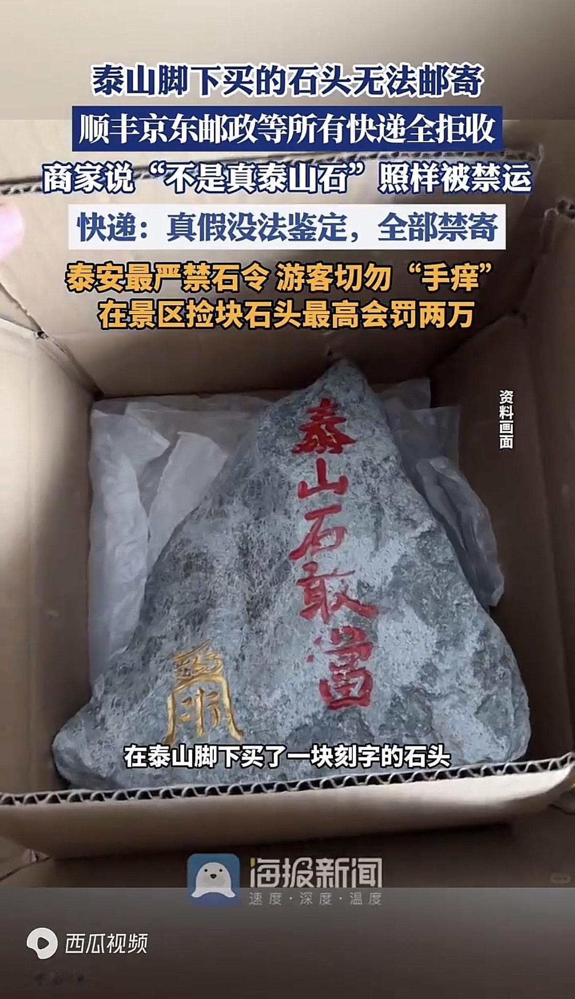 山东泰安,男子在泰山脚下买了块刻字石头,想寄回家留作纪念,谁料,所有快递公司都不接他这单,说石头属于禁寄品,男子这下没招了,只能把石头塞进行李箱,人肉背回去了! 这事儿说起来有点魔幻。这位大哥到了泰山脚下,看着路边摊贩摆的那些刻字石头挺有意思。 摊贩老板也是个实在人,直截了当地说:这就是个工艺品,不是真泰山石,也就是个纪念。 大哥一听,觉得反正也不贵,买一块留个念想,上面刻个“石来运转”或者“泰山石敢当”,带回家摆着或者送人都挺有面子。 当时买得挺痛快,可等到要回河北了,麻烦来了。 大哥寻思着,这玩意儿也不沉,找个快递寄回去得了,省得自己一路拎着累。结果这一问快递,直接给他整不会了。 他先找了一家熟悉的快递点,人家一听是从泰安寄石头,说这可寄不了。 大哥以为是这家网点服务不行,又换了一家,结果还是一样的话术。 最后他不信邪,把所有快递问了个遍,所有的快递小哥都像统一了口径一样:山东泰安的石头,一律不收。 有个好心的小哥偷偷跟大哥交了底,说不是我们不想赚你这钱,是真不敢收。现在泰安那边查得太严了,只要是石头,不管你是真的假的,只要从泰安发出去,就算违规。轻则罚款,重则扣证,我们为了几十块钱运费冒这个险,饭碗都得砸了。 这下大哥彻底懵圈了。看着脚边这块几十块钱买的工艺品,扔了吧,刚买的新东西,心里舍不得。不扔吧,又带不走。 最后实在没辙,大哥只能一边叹气一边把这块石头硬塞进了行李箱的角落里,还得用衣服裹好几层怕磕了碰了,就这么一路人肉背回了河北。 回到家跟朋友一说这事,大家都觉得离谱:买的时候好好的,怎么就成违禁品了? 其实这事儿还真不怪快递小哥一刀切,背后的原因挺严肃的。 有的人可能知道,泰山石那是有特殊意义的,早些年乱采乱挖太严重,为了保护山体和生态,泰安当地早就下了传说中的“最严禁石令”。 这个禁令不是闹着玩的,它是全方位的:禁采、禁售、禁存、禁运。 只要是从泰山上弄下来的石头,或者是泰山周边的石头,都在管控范围内。 这里头最让人头疼的就是“鉴定难”。你说你买的是工艺品,是假的,但快递员肉眼凡胎分不清啊!万一里面夹杂着一块真泰山石混出去了,这责任谁担? 为了保险起见,快递行业干脆就把泰安地区的石头全列为禁寄品。宁可错杀一千,不可放过一个。 而且这规定不光是针对买卖,就连游客自己在山上捡块小石头带走,那也是踩了红线。 景区里到处都立着大牌子,写着:禁止捡拾带离。 要是被巡逻的逮着,头一回是劝说教育,把石头放下走人。 要是不听劝或者情节严重的,直接就是一张罚款单。轻则500、1000,重则能罚到2万块! 所以说,那位河北大哥虽然觉得委屈,但也算是因祸得福了。 好在他买的是明确标注的工艺品,要是他手欠在山上顺手捡了一块,那现在面临的可能就不是寄不出去的问题,而是得掏腰包交罚款了。 所以说出门旅游,尤其是去这种有特殊保护对象的景区,买纪念品一定要长个心眼。别光看着好看就买,得先问问能不能带上火车、能不能寄快递。 像泰山石这种敏感物品,哪怕它是假的、树脂做的,只要是从那个地界发出来的,在物流系统里就是高危品。 出门就是图个乐,但别因为一时兴起买个小玩意儿,最后搞得自己狼狈不堪,甚至还得承担法律风险。 根据《泰安市泰山生态保护条例》第26条规定:任何单位和个人不得擅自采挖、运输、寄递、储存、交易泰山石。禁止在泰山风景名胜区以及周边区域销售泰山石或者假借泰山石名义销售其他石材。 河北游客遭遇的“寄递难”并非快递行业的无理拒收,而是源于泰安市为保护泰山生态与文化资源出台的地方性法规。 这个条例明确规定了“禁运、禁寄”条款,且不以石头的“真伪”作为豁免条件。 由于泰山石真假难辨,如果允许寄递,不法分子极易利用工艺品名义混运真石。因此,快递企业为规避合规风险,对泰安发出的石头实行“一刀切”拒收,实则是对严格监管的被动响应。 对游客而言,虽购买的是明确标注的“工艺品”,但在监管执行层面仍受限于源头管控。 在特定生态保护区内,部分传统纪念品的流通已被法律严格限制。出行前需了解当地特殊法规,避免因“不知法”导致财物滞留或面临行政处罚,如私自捡拾携带真石,最高可罚两万元。 有人说,如果真想要泰山石,告诉外地的朋友一个办法,就是你别去泰安!泰山不是一座山,是一座山脉,他余脉一直延续到我们济南这边,沿着泰山的余脉去找,很多地方其实都有。像我们济南的南部山区那些小河里面的,经常能捡到被冲下来的泰山石,是一样的东西,随便拿! 对此,你怎么看? 关注@运良说法 学法律知识不迷路