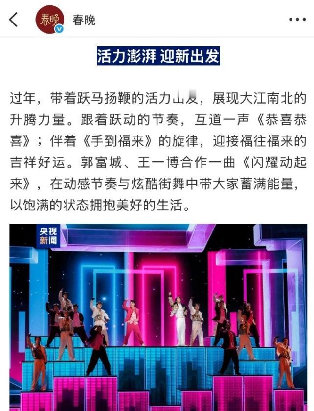 王一博春晚节目曝光! 王一博的春晚彩排行程一直非常保密,没有公开行程,也没有路透摆拍,央视春晚主动曝光了王一博的春晚节目,王一博将搭档天王郭富城共同带来唱跳节目《闪耀动起来》,第三次登上春晚,依旧是双人合作舞台,大部分流量明星都是多人拼盘节目,演唱类节目双人舞台已经算是比较高规格了,当然,单人舞台是最高规格。