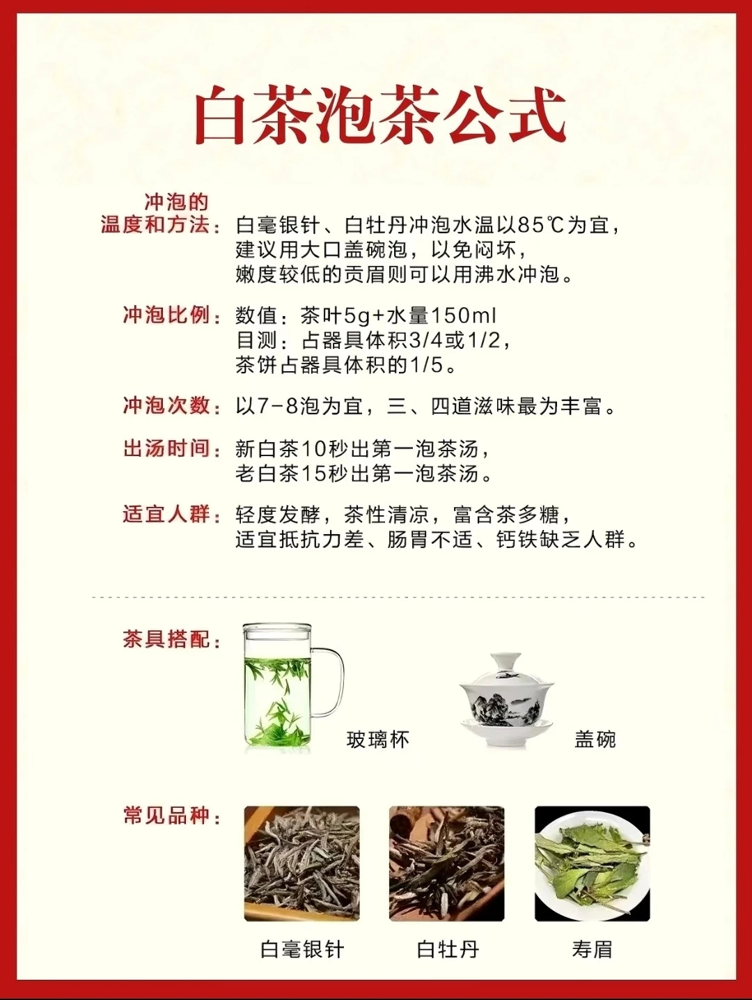 • 新白茶:5-7g/200ml,90-95℃,首泡30秒,顺延15秒