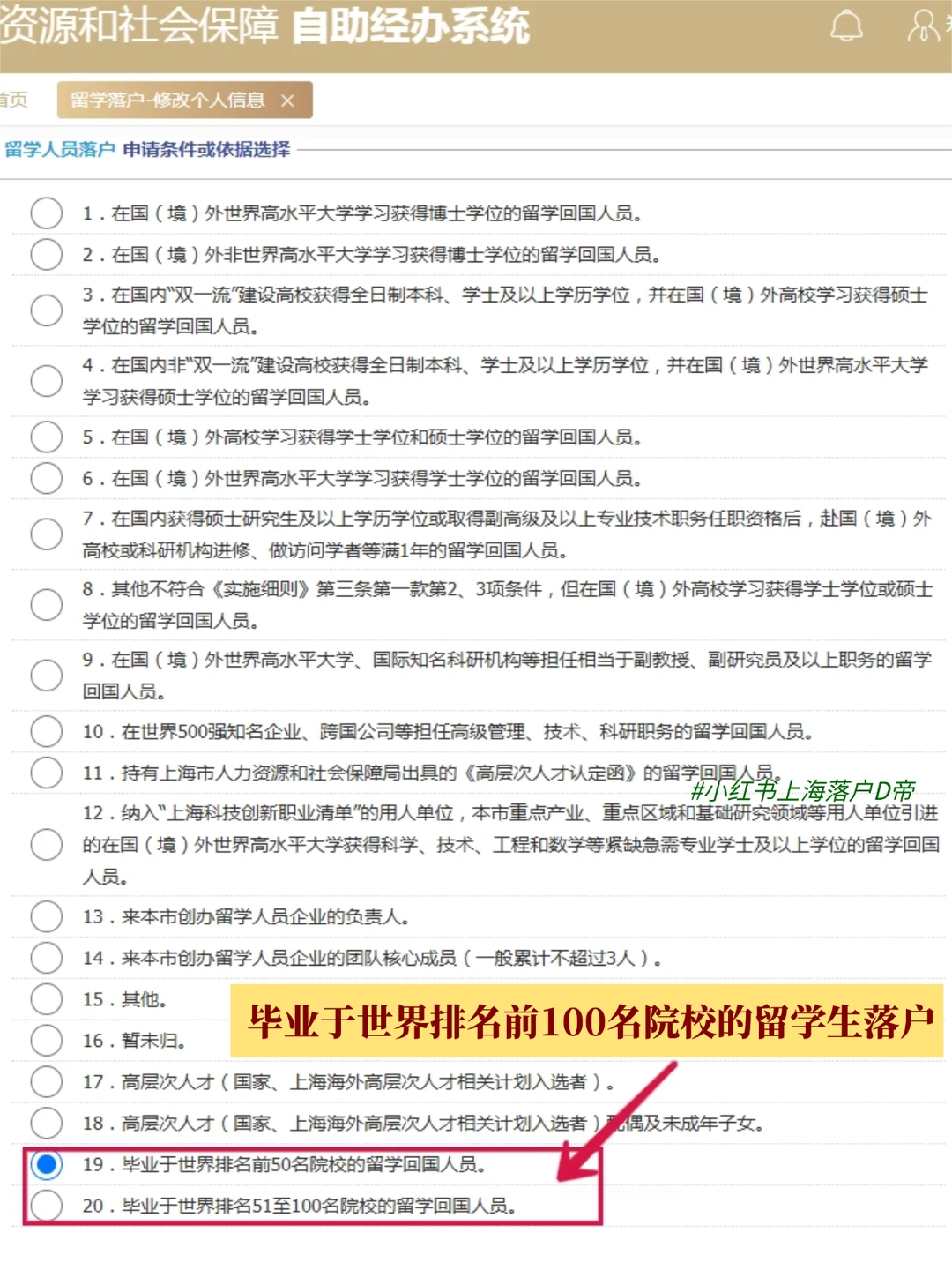 留学生须在回国后的2年内来沪工作并开始缴纳社保,超过2年待业期就不能用留学生的身份落户了。 [一R].毕业于世界排名前50名院校的留学生,过试用期即可直接申办落户上海,无社保缴纳时间和基数要求! [二R].毕业于世界排名51-100名院校的留学生,交满6个月社保即可申请落户,无社保基数要求!