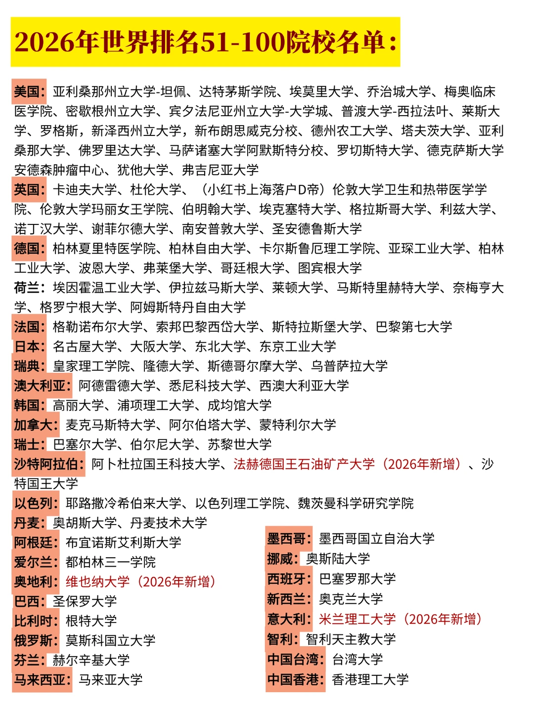 2026年世界排名前100名院校名单!