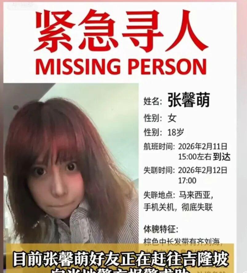 18岁女孩飞马来西亚一天后失联, 说被扣住趴在地上, 手机关机再没响过。 时间是2月11号下午3点落地吉隆坡,2月12号傍晚6点发了最后几条消息,之后就没了音讯。 到现在已经整整7天,不是6天,也不是“快一周”,就是168小时。 她叫张馨萌,天津人,18岁,确诊双相情感障碍,父母离异,之前和男友住在常州,和家里联系很少。 出发前跟朋友说要去香港、新加坡,结果航班直飞吉隆坡,连新加坡的边都没沾。 最后那几句话,有的说是“我被扣住”,也有的听成“斧头把我扣住”,但不管是哪句,语气都很急,很怕。 她说“别给我发消息”“马上要交手机了”,之后电话就关了,微信也不回。 外交部领保中心收到了求助,消息转给了中国驻马来西亚大使馆。 她的好友佳怡已经飞到吉隆坡,在当地报了警,把聊天记录、病历、机票都交了。 马国警方有没有查机场监控? 有没有查她落地后的手机信号? 这些没人说清楚。 深圳航空那趟ZH327的乘客名单,也没人提是否调取。 一个姑娘,自己买票飞出国,24小时内彻底消失,留下的只有四句话和一个关机的手机。 人还没找到。