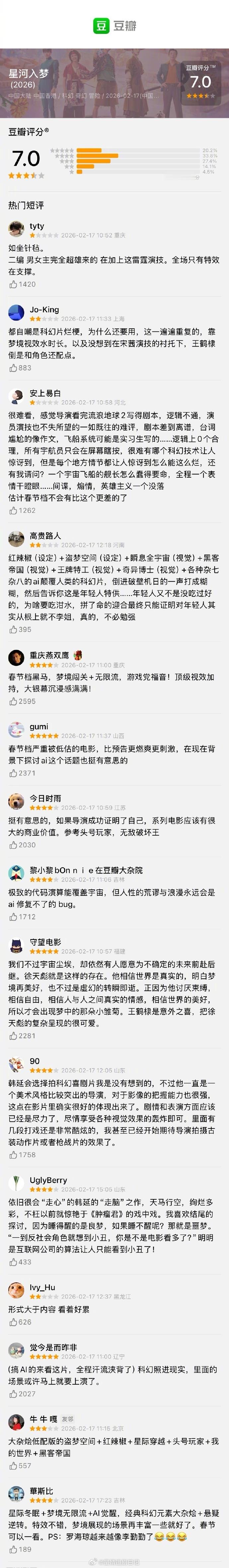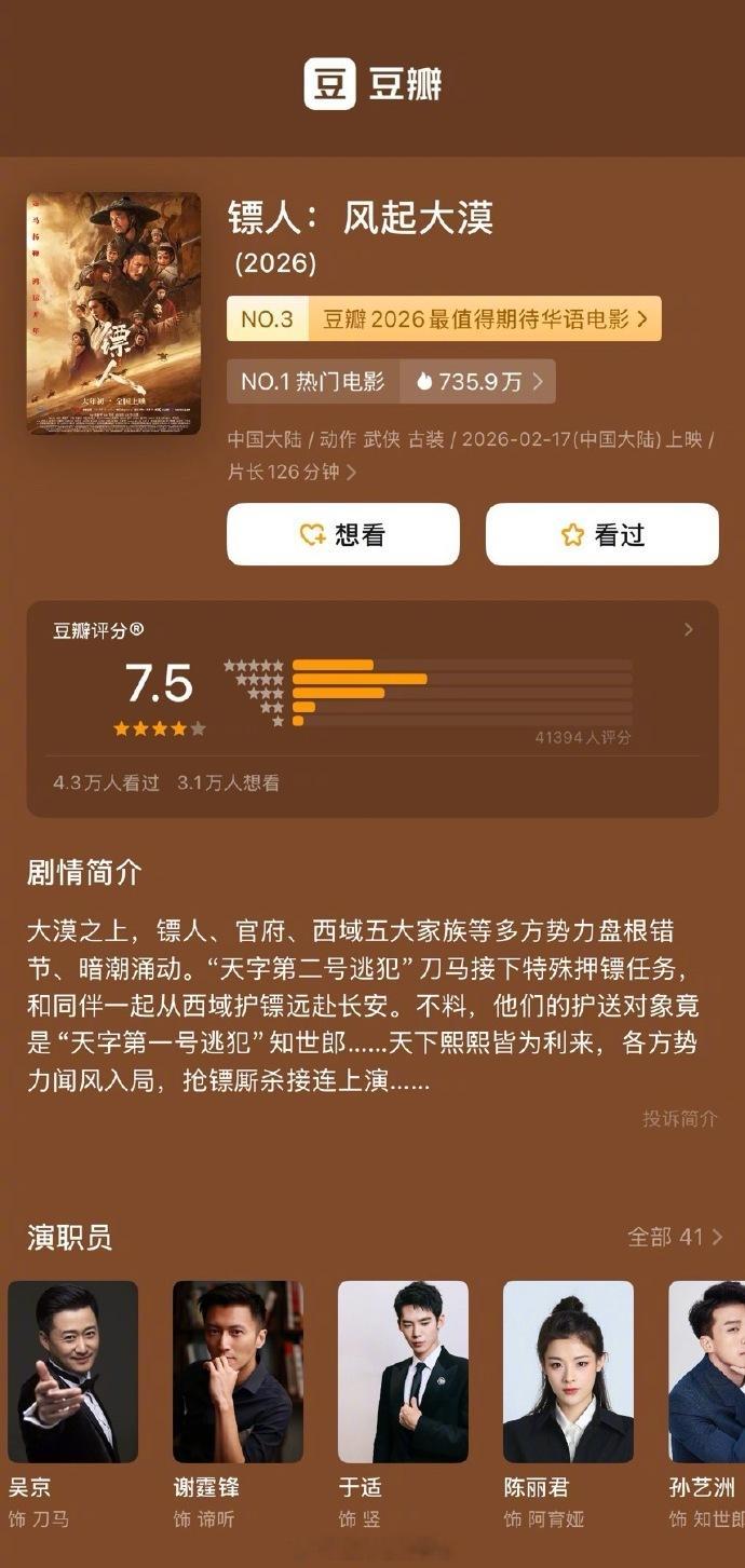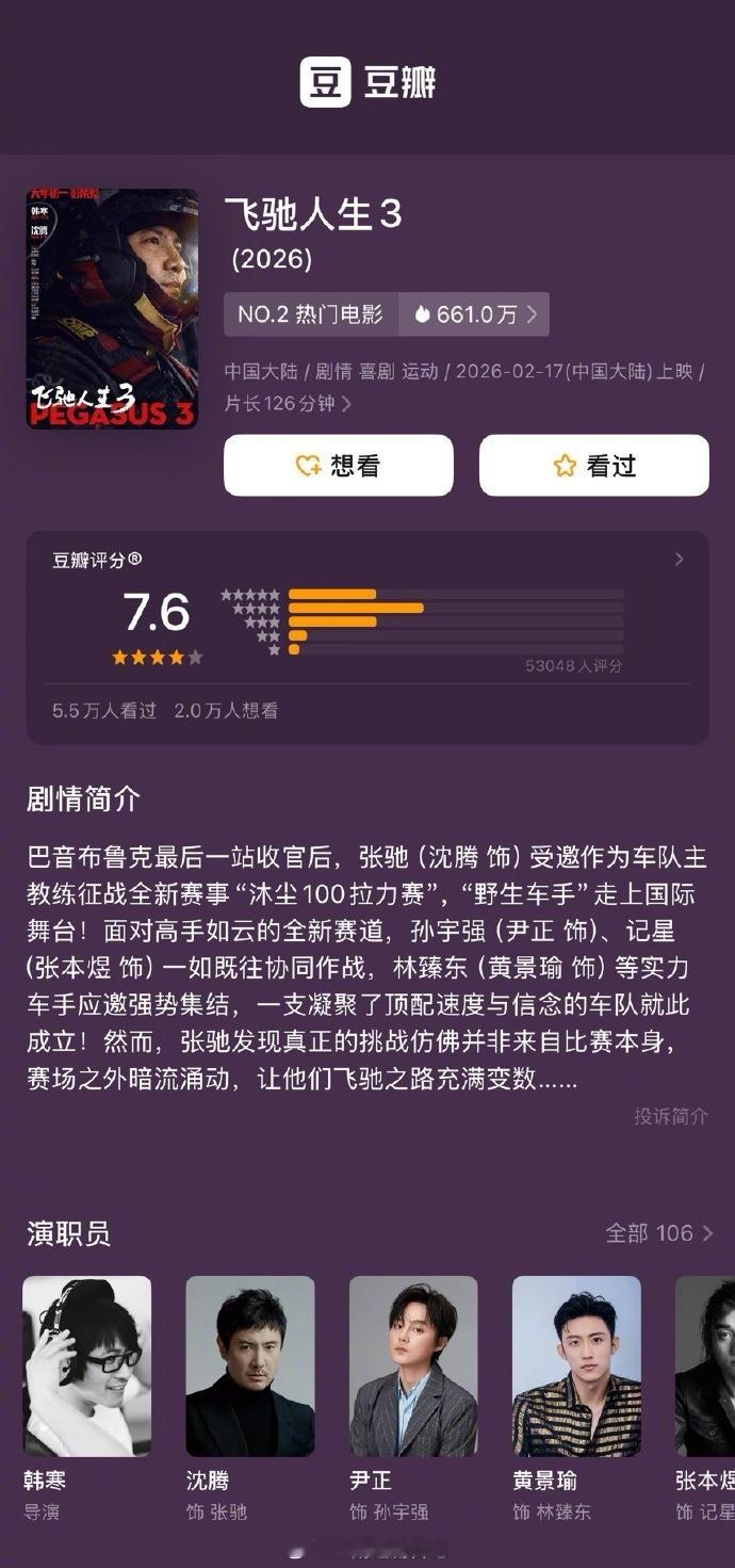 春节档的电影评分出来了:《飞驰人生3》7.6分《镖人》7.5分《星河入梦》7.