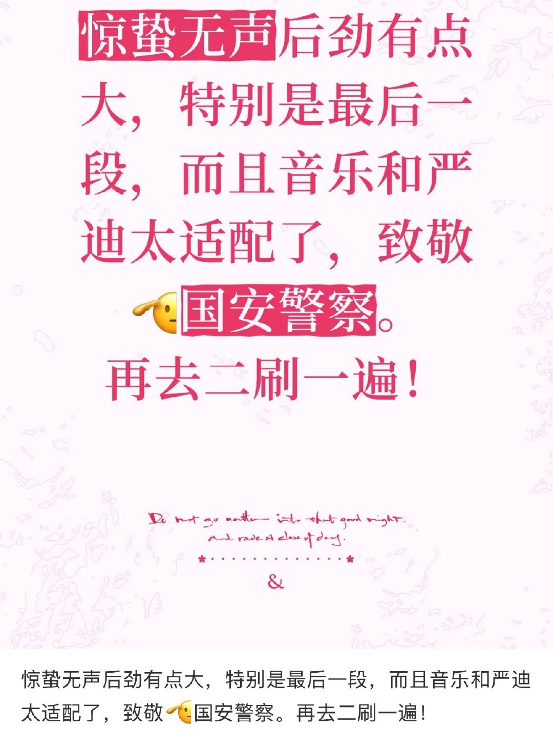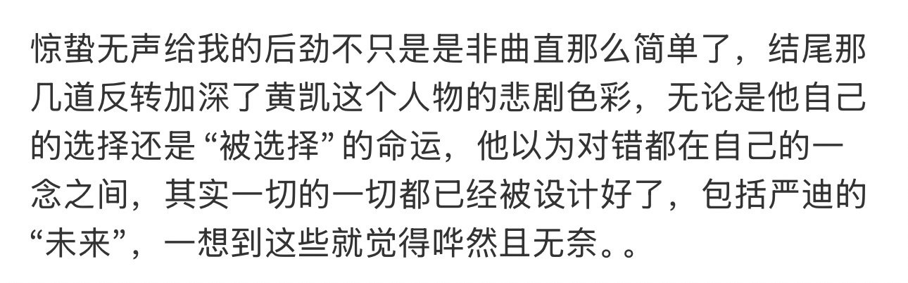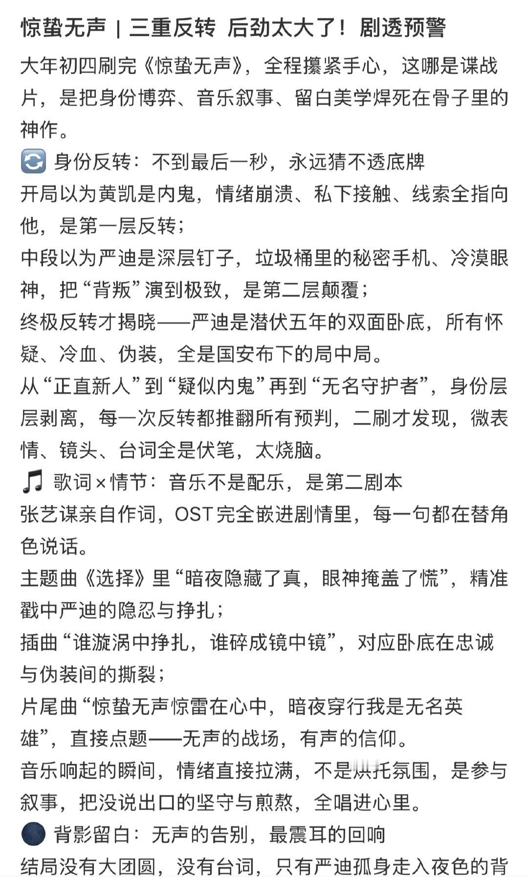 惊蛰无声后劲 惊蛰无声后劲好大 看完《惊蛰无声》真的久久走不出来,严迪才是全片最让人心疼的存在。五年卧底路步步如履薄冰,对前辈忠诚,对同事温柔,全都藏在平静语气里,后劲直接拉满。