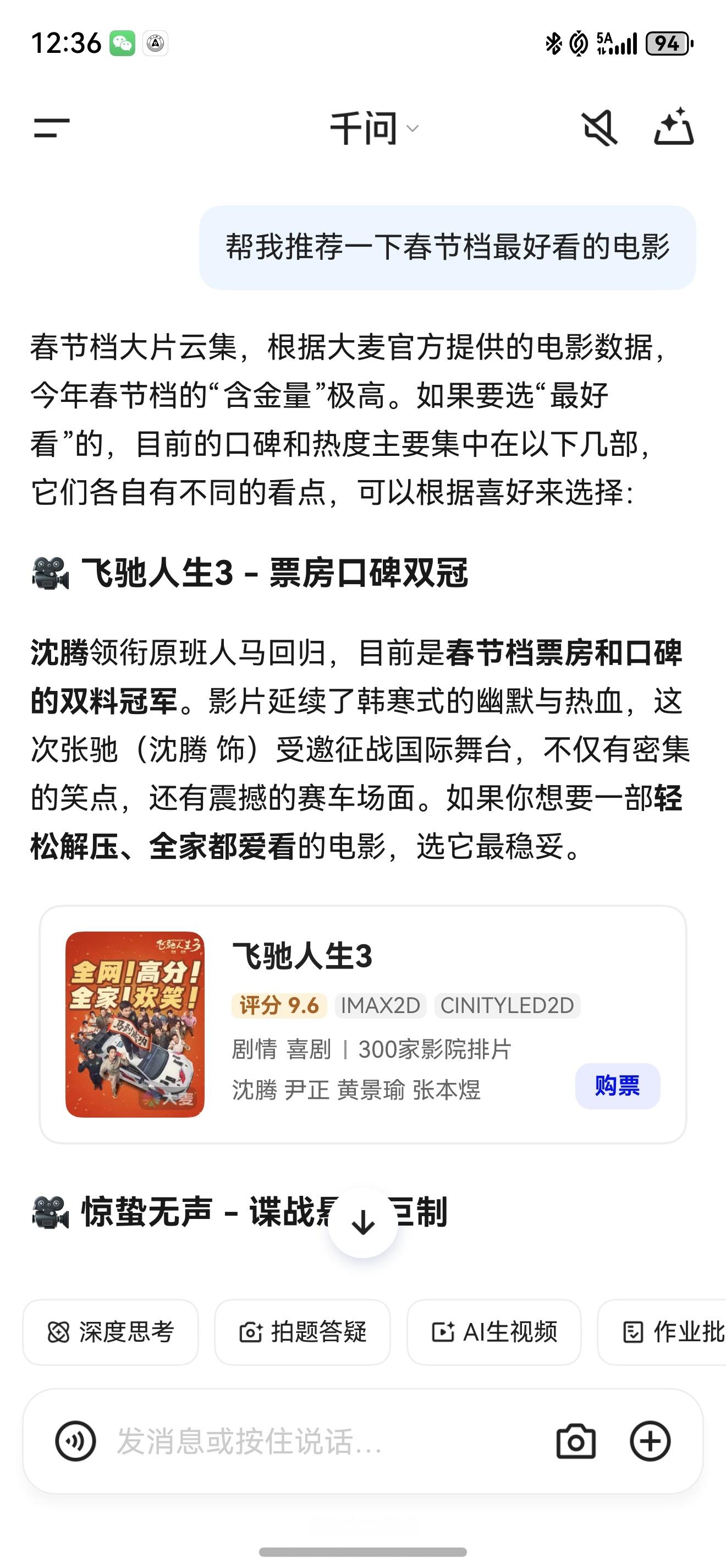 千问是真的全能,从写文案到P图再到生活常识,各种问题,只要你不懂的,都可以问它。这就已经很方便了吧?过年还整大活儿,前两天我家人用千问点奶茶看电影买生鲜都有折扣,现在家人都养成习惯了,干个啥都要先问一下千问~