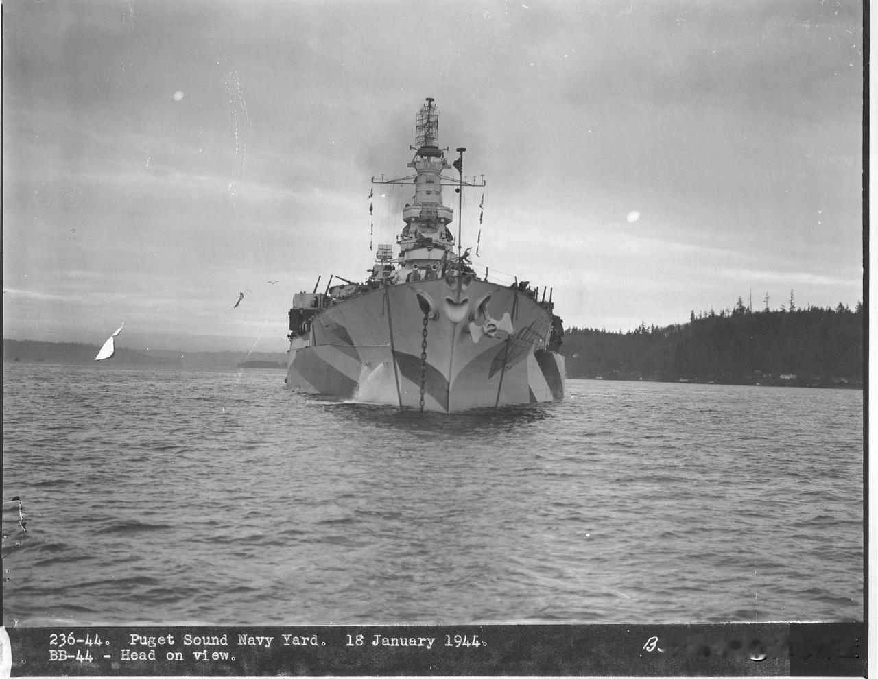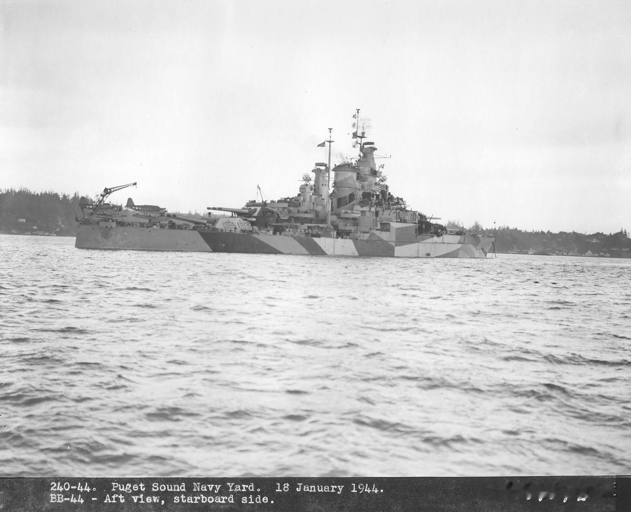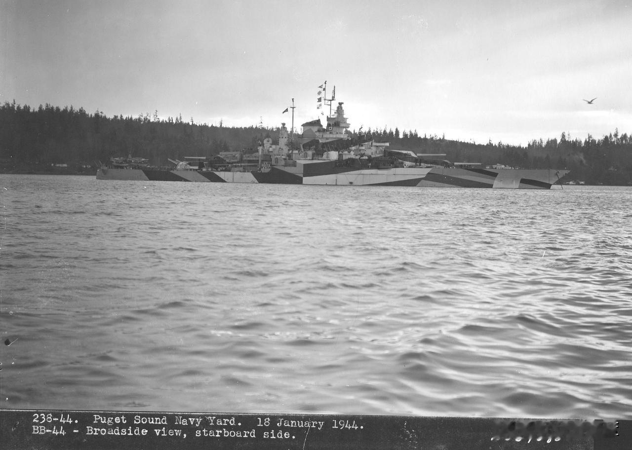 完成改装后的“加利福尼亚”号战列舰 时间1944年1月18日,地点位于普吉特湾,完成改装后的“加利福尼亚”号战列舰(属于“田纳西”级)各个角度照片。此时涂装的是经典的32/16D迷彩。 珍珠港劫难后,加利福尼亚号于1942年被打捞并彻底改装。其满载排水量增至约4万吨,改用现代化的单烟囱舰桥。武备核心仍为4座三联装356毫米主炮,但副炮统一为16门127毫米高平两用炮,并加装大量40毫米博福斯与20毫米厄利孔机炮,形成严密防空网。辅以先进雷达,尽管航速仍为21节,但已脱胎换骨,于1944年重返战场。战列舰 美国海军战列舰 美军战列舰