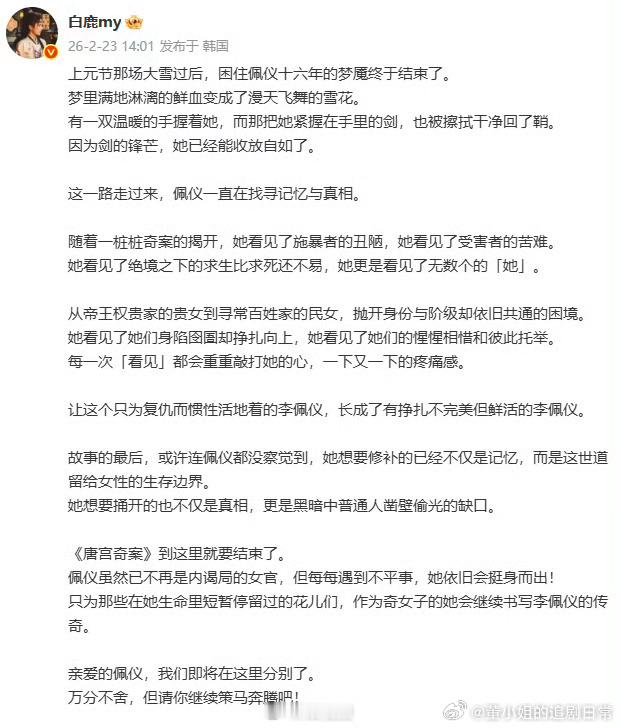 唐宫奇案 我的评分:白鹿长文告别唐宫奇案李佩仪白鹿告别唐宫奇案李佩仪白鹿长文告别👖唐宫奇案,这文章真的太走心了,看着李佩仪从复仇到释怀,真的好舍不得!
