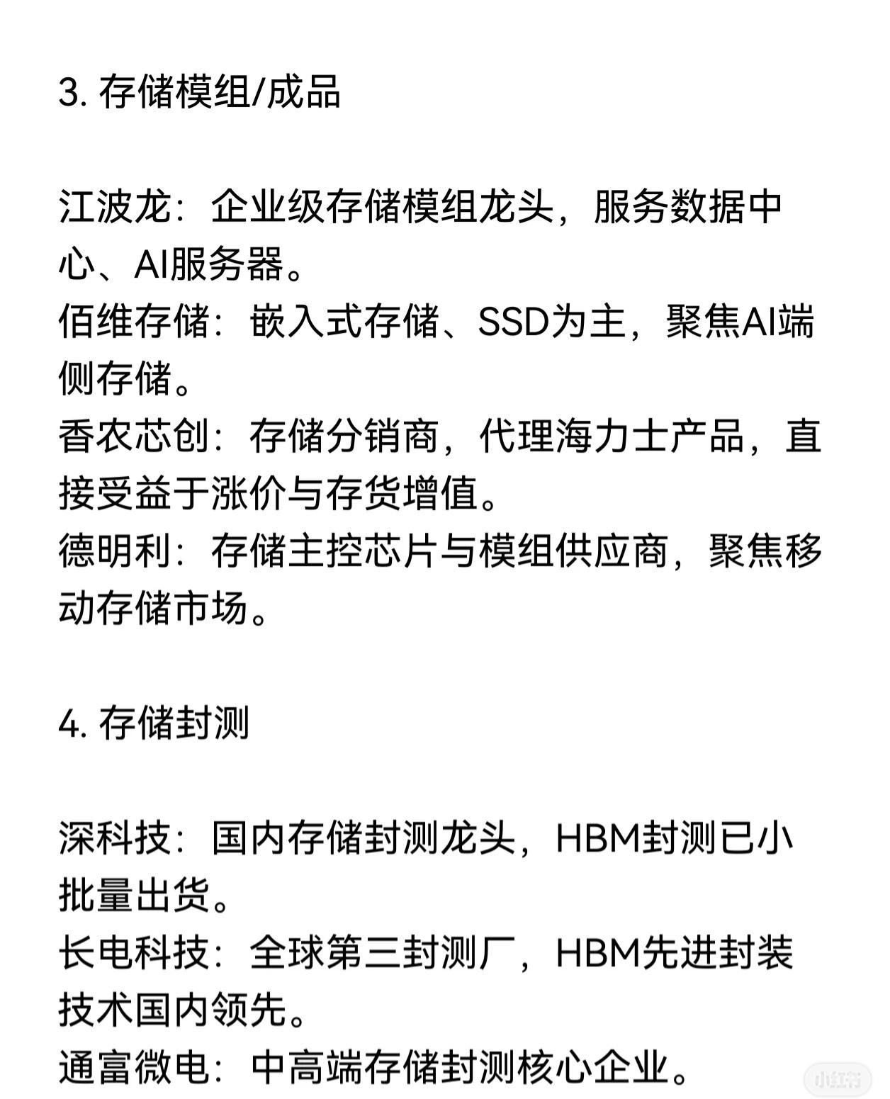 存储芯片涨价背景下,从设计到制造、模组、封测再到材料设备的全产业链受益公司,可按环节梳理如下: 一、存储芯片设计(核心环节) - 兆易创新:国产存储设计龙头,NOR Flash全球前三。 - 澜起科技:全球内存接口芯片龙头,DDR5市占率超45%。 - 北京君正:车规存储龙头,SRAM全球第一、DRAM全球第二。 - 东芯股份:中小容量存储龙头,SLC NAND国内第一。 - 聚辰股份:SPD芯片全球第一,DDR5 SPD双寡头之一。 - 普冉股份:低功耗EEPROM龙头,NOR Flash布局完善。 - 国科微:固态存储主控芯片龙头。 - 联芸科技:SSD主控芯片龙头。 二、存储制造 / 晶圆代工 - 中芯国际:国内晶圆代工龙头,为存储大厂提供成熟制程代工。 - 华虹公司:特色工艺代工龙头,覆盖利基型存储芯片制造。 三、存储模组 / 成品 - 江波龙:企业级存储模组龙头,服务数据中心、AI服务器。 - 佰维存储:嵌入式存储、SSD为主,聚焦AI端侧存储。 - 香农芯创:存储分销商,代理海力士产品,受益涨价与存货增值。 - 德明利:存储主控芯片与模组供应商,聚焦移动存储市场。 四、存储封测 - 深科技:国内存储封测龙头,HBM封测已小批量出货。 - 长电科技:全球第三封测厂,HBM先进封装技术国内领先。 - 通富微电:中高端存储封测核心企业。 五、存储材料 / 设备 - 雅克科技:存储材料隐形冠军,HBM核心前驱体供应商。 - 沪硅产业:12英寸硅片龙头,存储芯片基底核心材料。 - 安集科技:存储抛光液/研磨液供应商。 - 深南电路:存储芯片载板、高密度PCB龙头。 - 精智达:存储测试机国内龙头。 - 华海诚科:HBM封装材料核心标的,国内唯一量产HBM专用GMC材料。 - 北方华创:设备平台龙头,国内存储大厂核心设备供应商。 - 中微公司:刻蚀设备领先,产品批量用于国内存储产线。 - 拓荆科技:薄膜沉积国内唯一,全面覆盖国内存储产线。 - 长川科技:存储测试设备龙头。