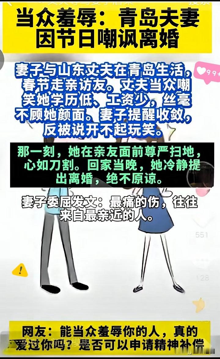 人前不训子,堂前不训妻,老祖宗的话真的一点都没错。 山东青岛一对夫妻春节走亲戚,丈夫当着所有亲友的面,嘲笑妻子学历低、赚得少,妻子提醒他别再说了,他反倒说妻子开不起玩笑。 回家后,妻子冷静提出分开,没有纠缠,绝不原谅。真正压垮婚姻的,从来不是大事,而是这种不被尊重、当众难堪的寒心。 总有人把刻薄当幽默,把贬低当本事,靠打压最亲的人找存在感,这不是情商低,是骨子里自私又没教养。夫妻本是共同体,你让伴侣没面子,自己也同样丢人。 好的婚姻,是在外人面前互相撑腰,不是互相拆台。不懂得维护伴侣体面的人,真的不值得留恋。