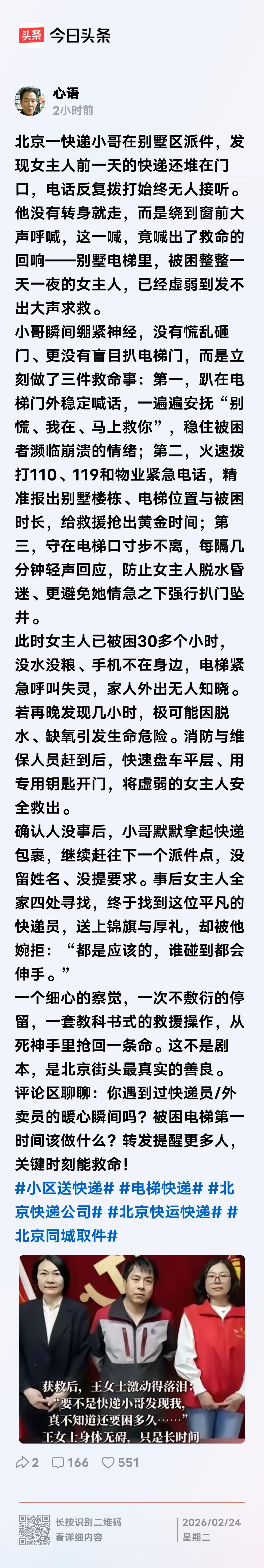 这个外卖小哥的一个细心的举动,也是一种极其负责任的行为,救了一个人的命,细心和负责任的背后,展现的是他的善良,对这个女子来说,这个外卖小哥就是她一生遇到的最大的贵人,一定要好好感恩人家,救命之人,永远不要忘记!