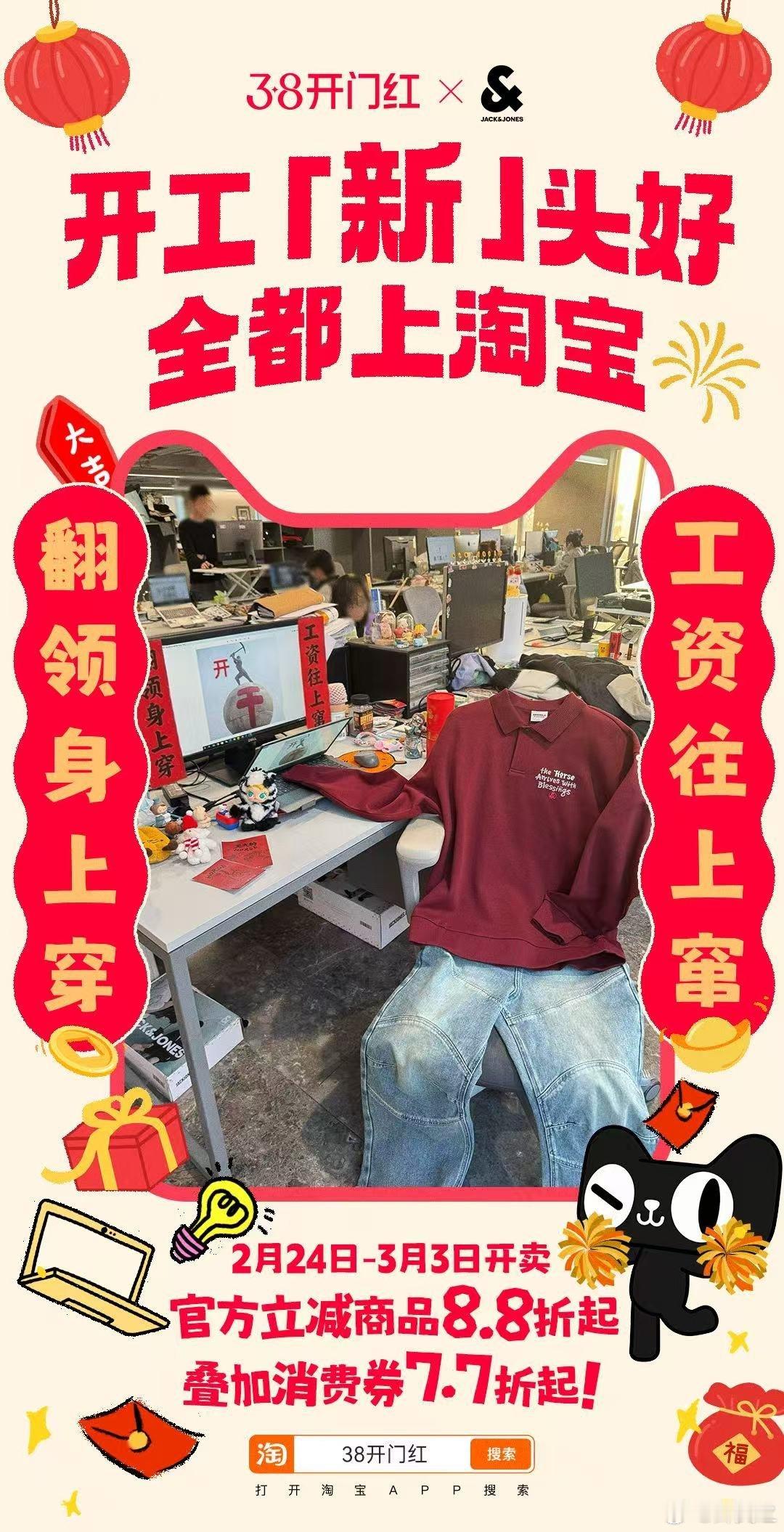 上淘宝开工淘个好彩头开工新头好全都上淘宝开工仪式感拉满才够味,焕新好物不能少!天猫搜【38开门红】,官方立减8.8折起叠券7.7折起,杰克琼斯傍身,新一年职场一路开挂~